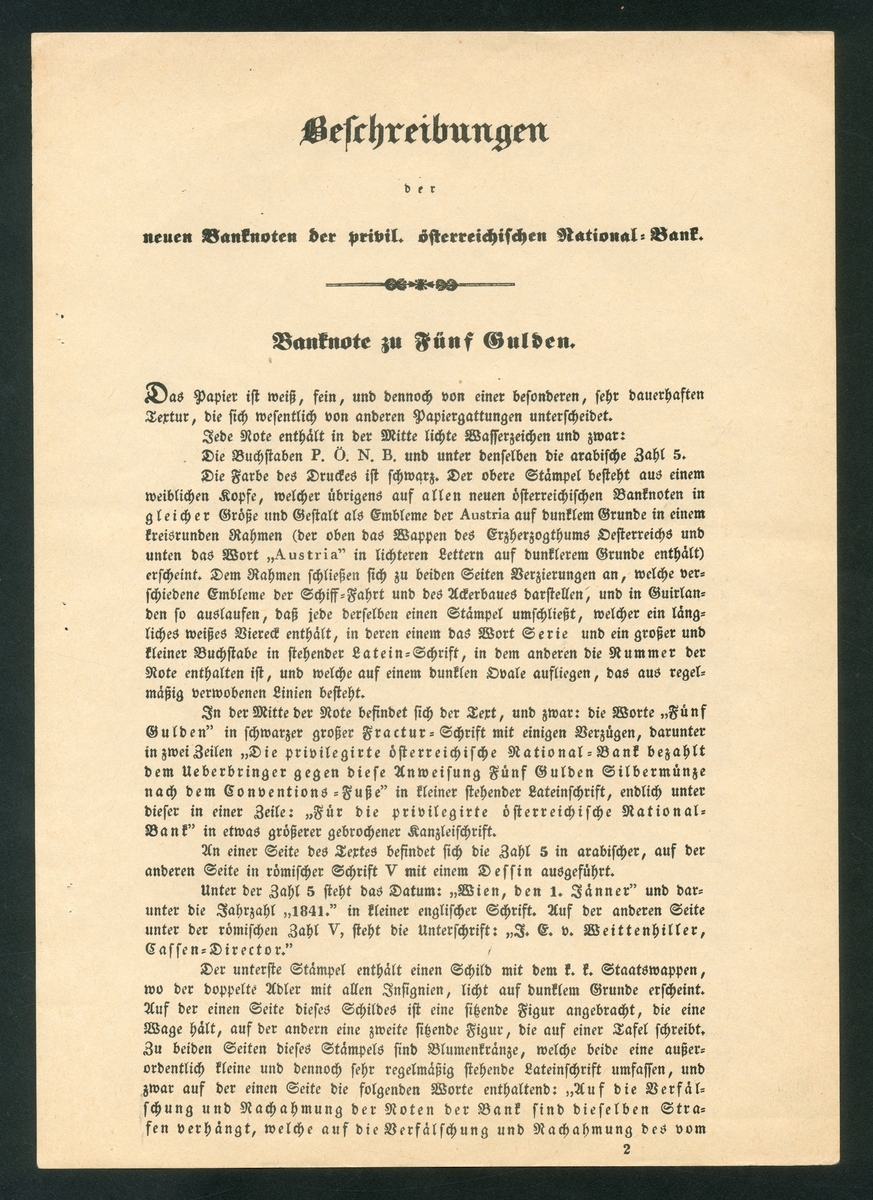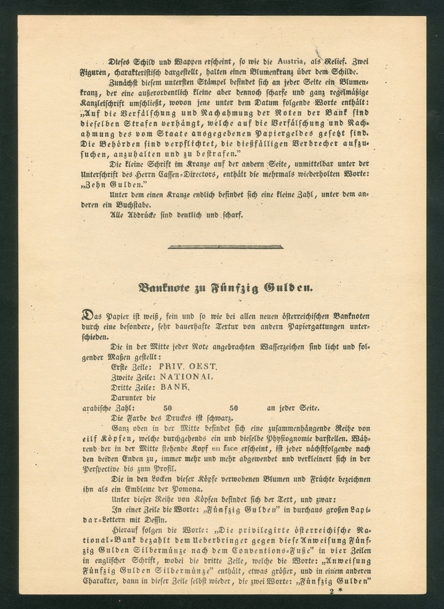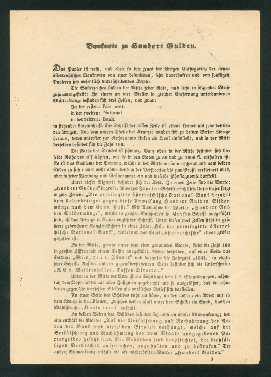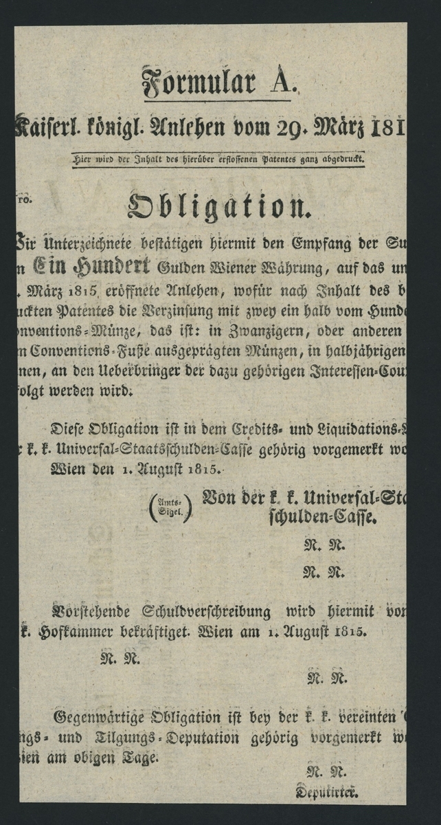 announcement relating to the new 1815 issue of 100, 200, 500, 1000 & 50000 Gulden interim notes, in facing columns of German and Czech, 15th April 1815, Prague (5 pages), together with a sample interim 100 gulden note,