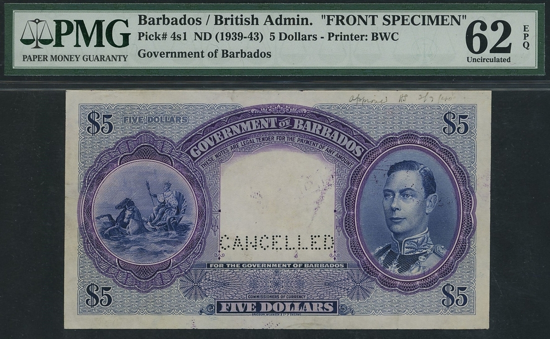 Barbados, British Administration, front specimen $5, 1939-43, (Pick 4s1), in PMG holder 62 EPQ Uncirculated, printer's annotations, as made ink
