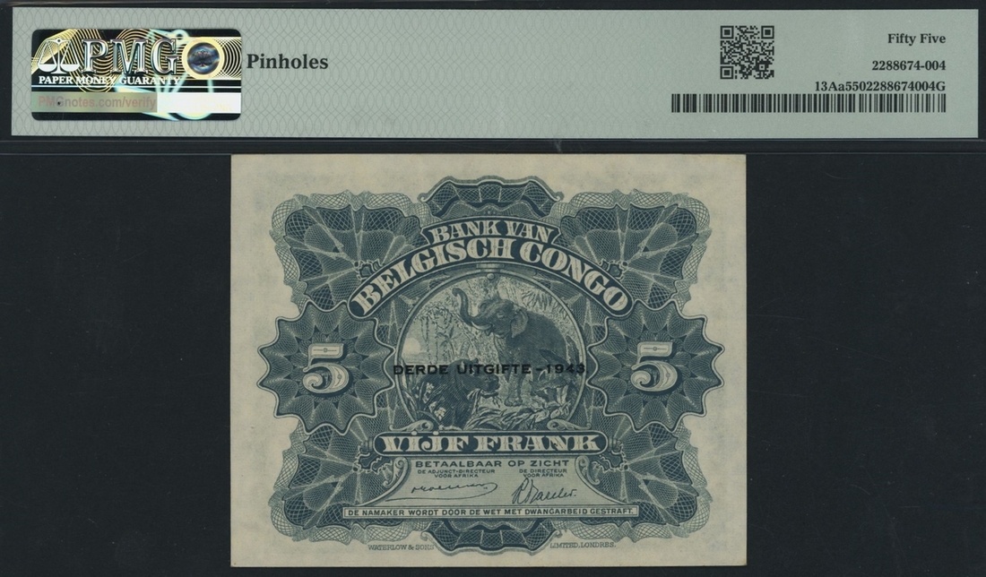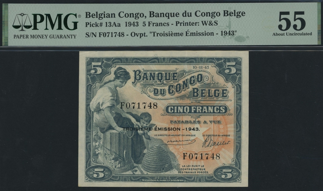 (x) Banque du Congo Belge, 5 Francs, 1943, serial number F071748, troisième émission overprint,