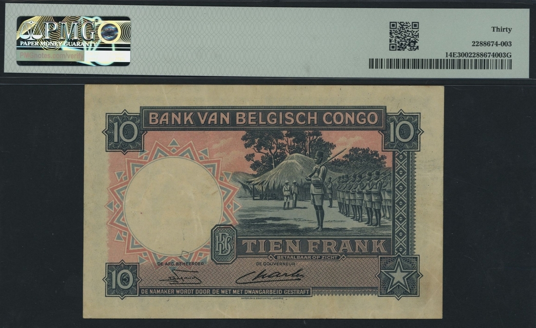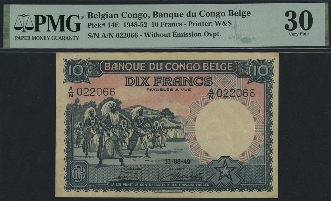 (x) Banque du Congo Belge, 10 Francs, 15th August 1949, serial number A/N 022066, (Pick 14E, BNB 214d), in PMG holder 30 Very Fine