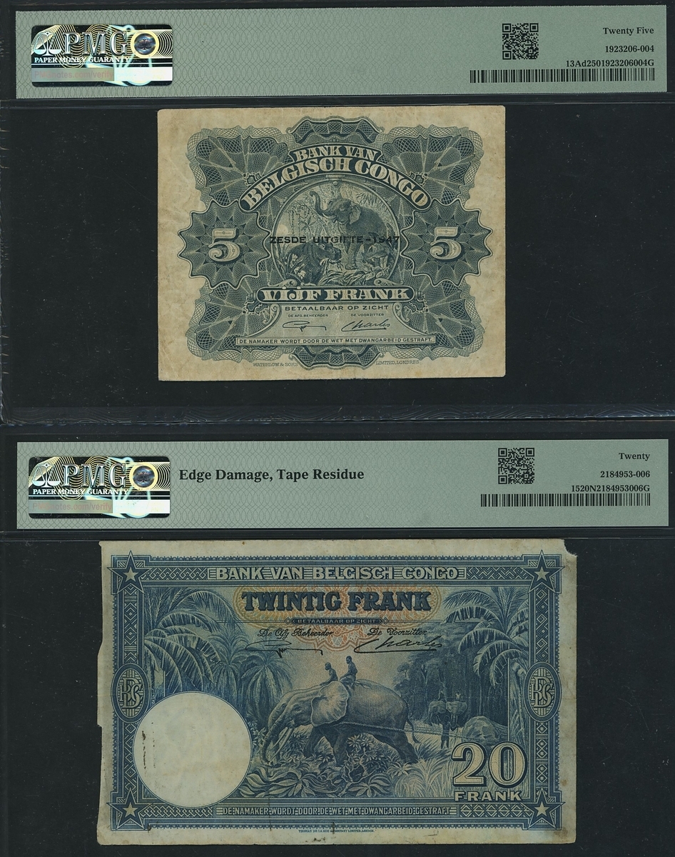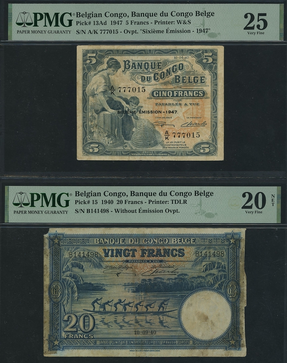 (x) Belgian Congo, [2 notes] 5 Francs, 1940-47, 5 Francs, sixème émission, 1947, serial number A/K 777015,