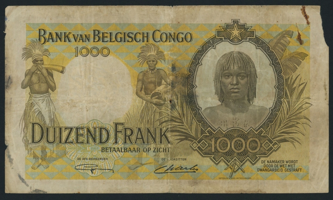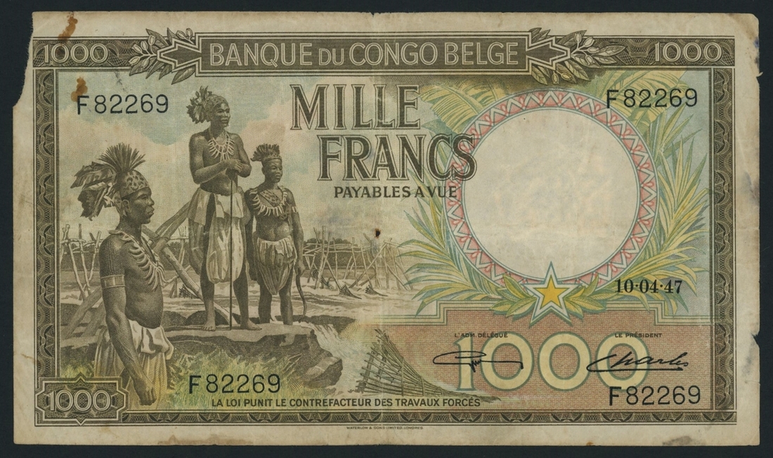 (x) Banque du Congo Belge, 1000 Francs, 10th April 1947, serial number F 82269, (Pick 19b), piece missing from upper left corner, a few minor pieces missing from top and right margin and internal tear at centre, ink, stains and some rust, otherwise about fine