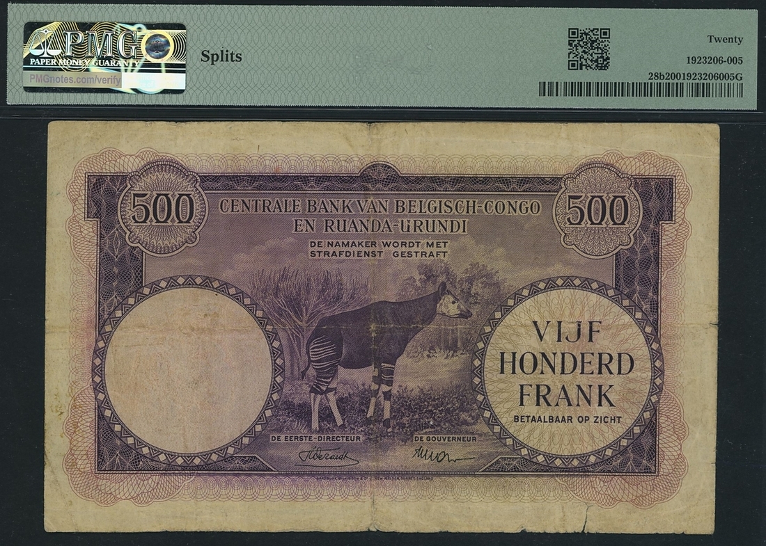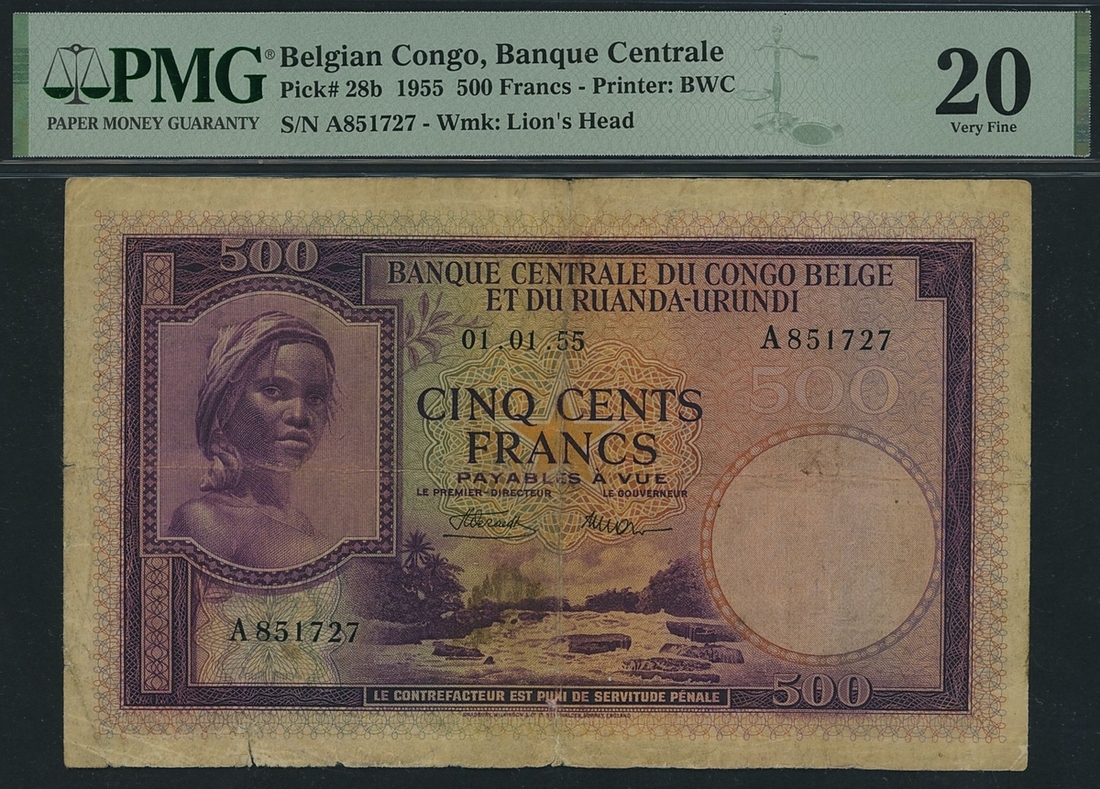 (x) Belgian Congo, 500 Francs, 1st January 1955, serial number A851727, signature Deraedt - Martin,