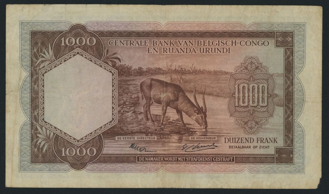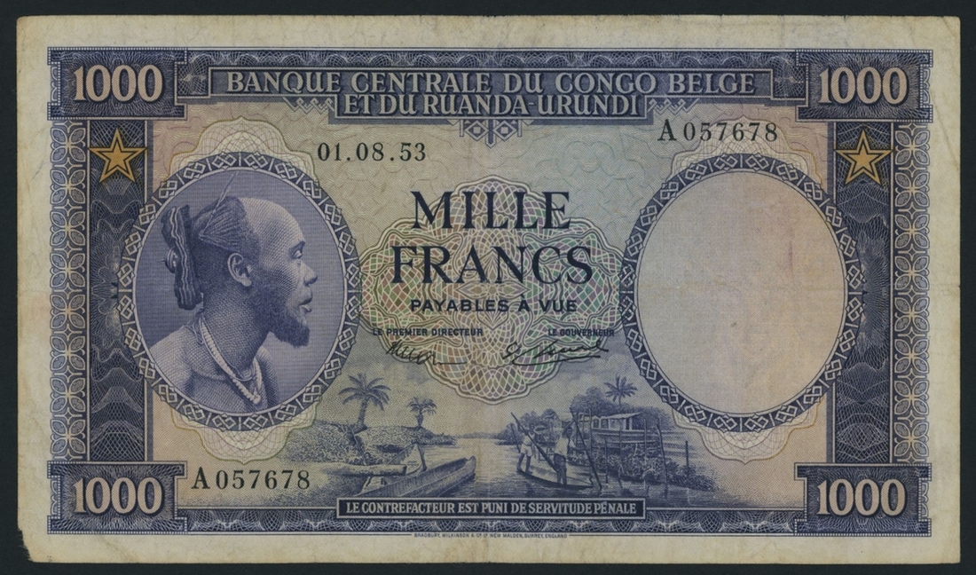 (x) Banque Centrale du Congo Belge et du Ruanda-Urundi, 1000 Francs, 1st August 1953, A 057678, (Pick 29a, BNB B309a), small piece missing from lower left corner, otherwise good fine