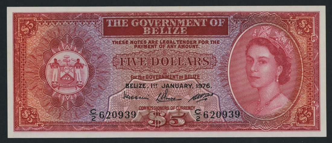(x) Government of Belize, $5, 1st January 1976, serial number C/2 620939, (Pick 35b, BNB 103b), uncirculated