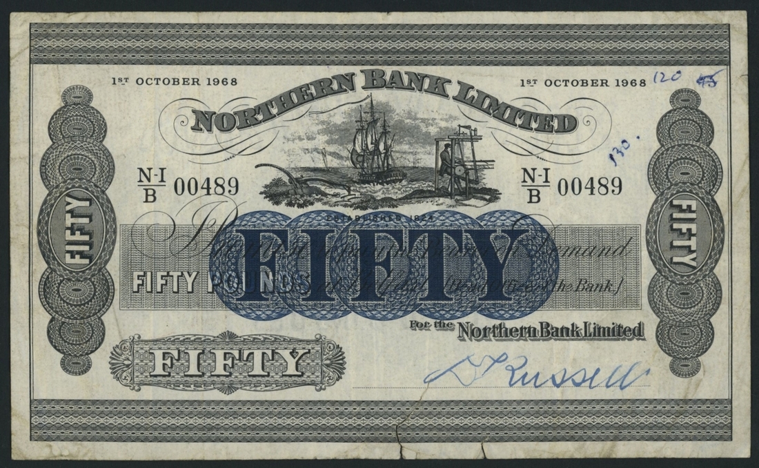 Northern Bank Limited, Northern Ireland, £50, 1st October 1968, serial number N-I/B 00489, (PMI NR84), tears to bottom of note, otherwise very fine