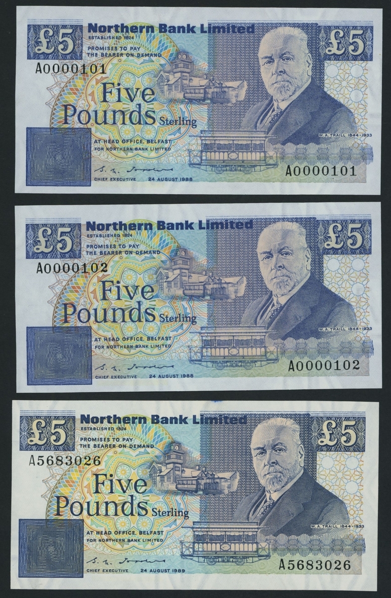 Northern Bank Limited, [3 notes], £5, 1988-1989, consecutive pair, 24th August 1988, serial number A0000101, 102,