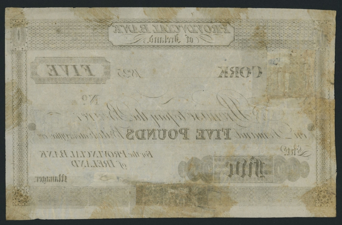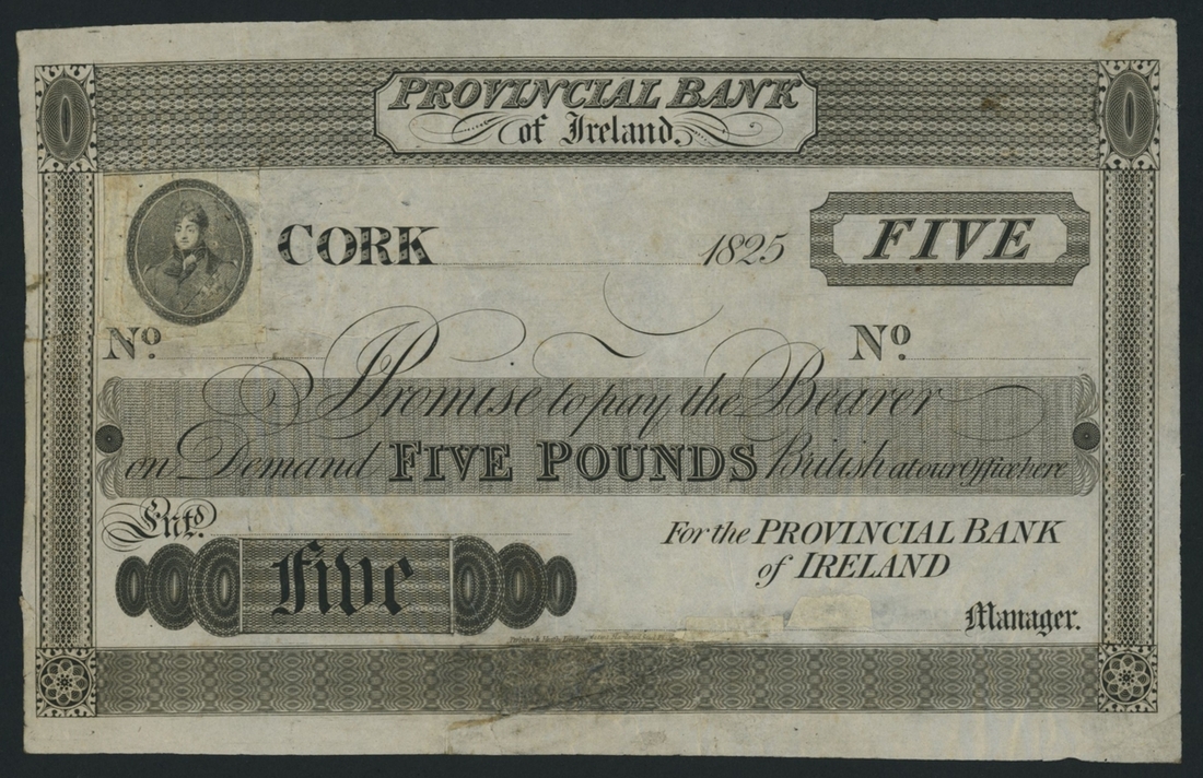 Provincial Bank of Ireland, proof £5, Cork, 1825, (PMI PR 8), repairs and reconstruction, otherwise good fine, slight staining on reverse