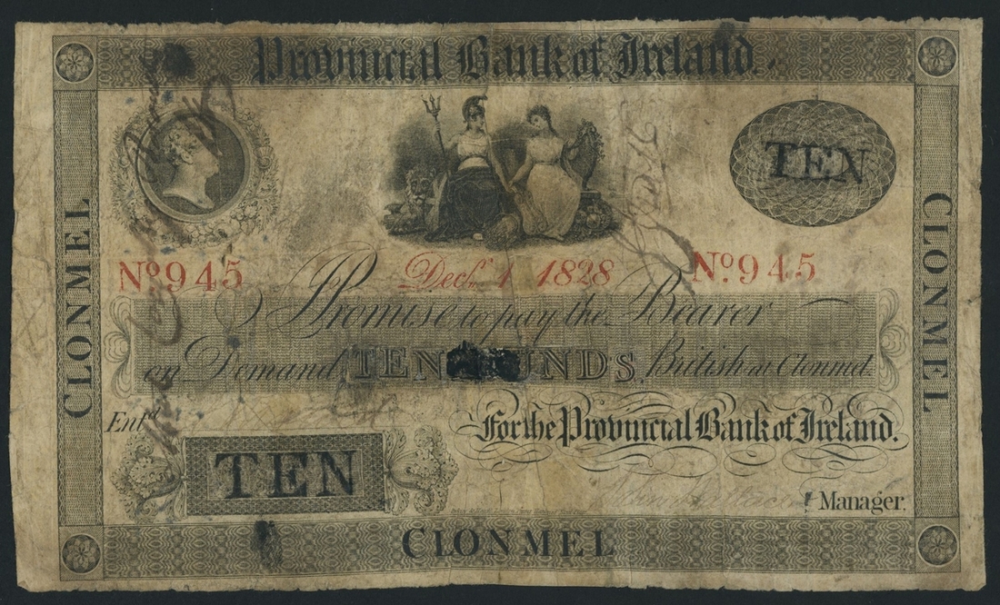 Provincial Bank of Ireland, £1, altered to £10, Clonmel, 1st December 1828, serial number 945, denomination panel has been altered to read 'TEN' and 'TEN POUNDS',