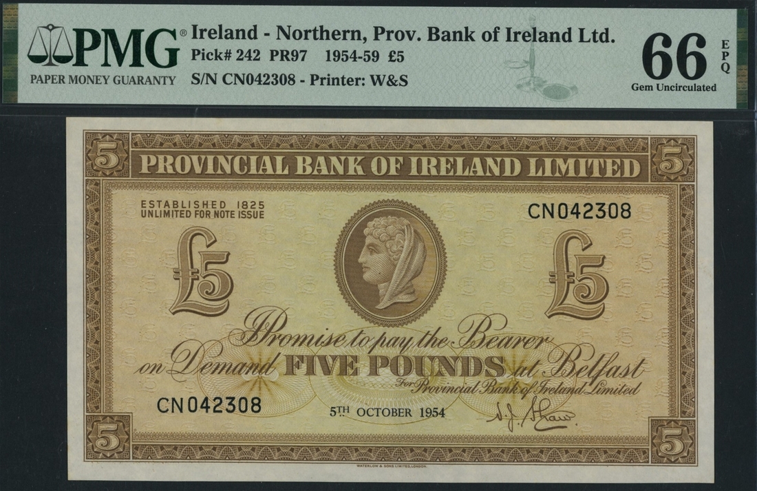 (x) Provincial Bank of Ireland Limited, Northern Ireland, [TOP POP] £5, Belfast, 5th October 1954, serial number CN042308, 1st issued date for the type,
