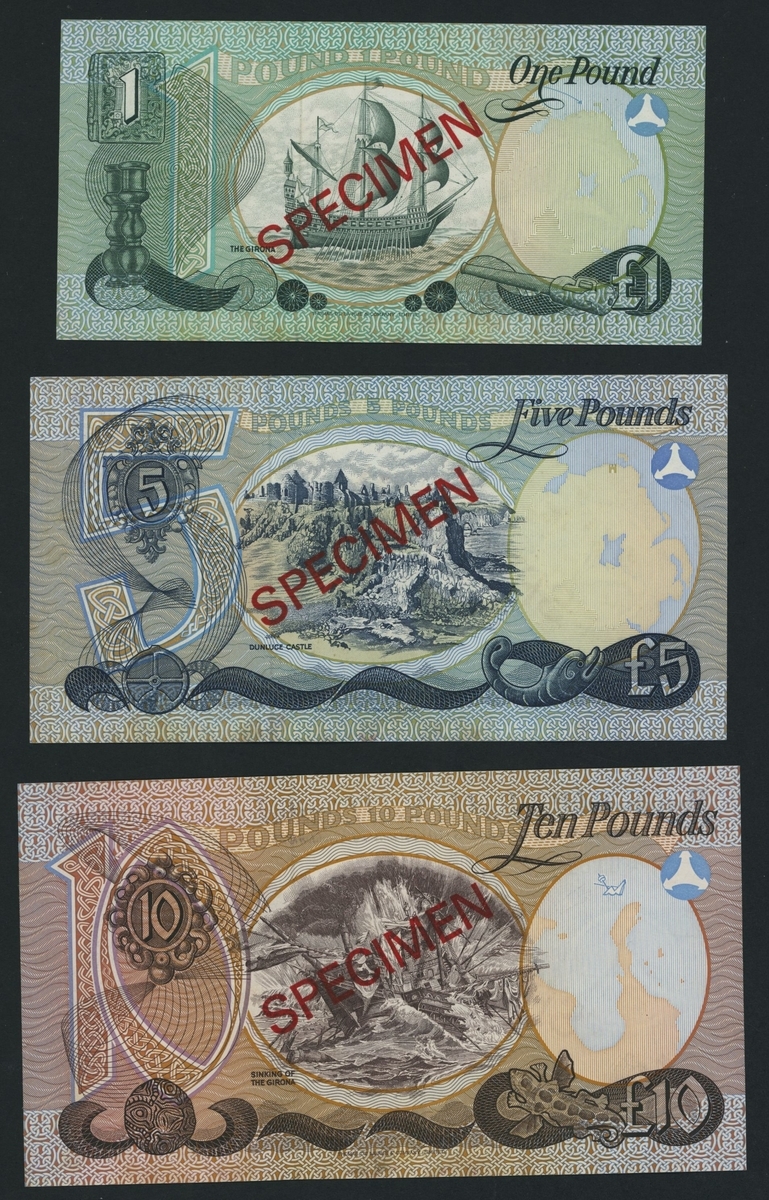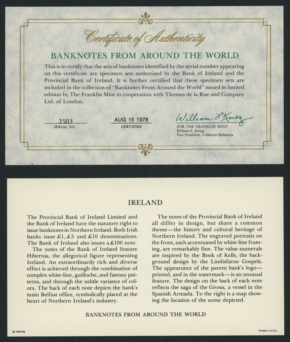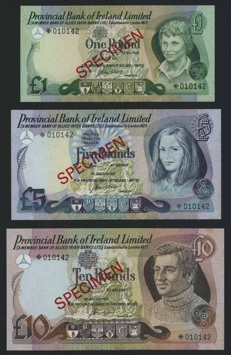 Provincial Bank of Ireland Limited, [3 notes] specimen £1, £5, £10, Belfast, ND (1978), serial number *010142, Maltese cross prefix. Lot includes the Franklin Mint certificate of authenticity, as well as the Franklin Mint 'Ireland' information page,