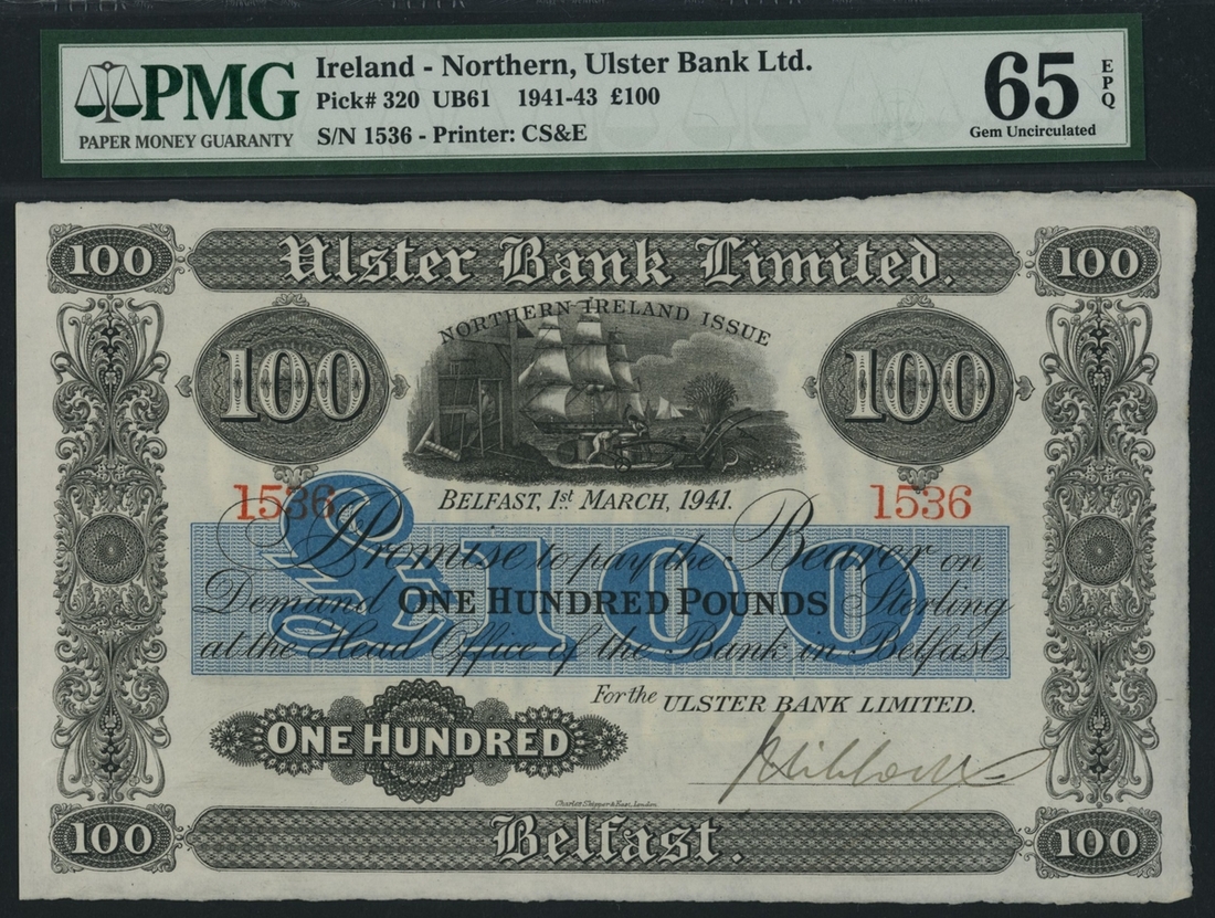 (x) Ulster Bank Limited, Northern Ireland, *TOP POP* £100, Belfast, 1st March 1941, serial number 1536, 1st date of the highest denomination issued by the bank, handwritten signature,
