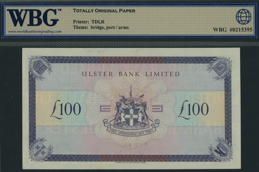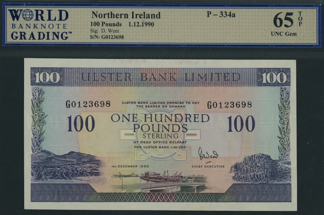 (x) Ulster Bank Limited., Northern Ireland, £100, Belfast, 1st December 1990, serial number G0123698, (PMI UB86, Pick 334a), in WBG 65 TOP Uncirculated Gem