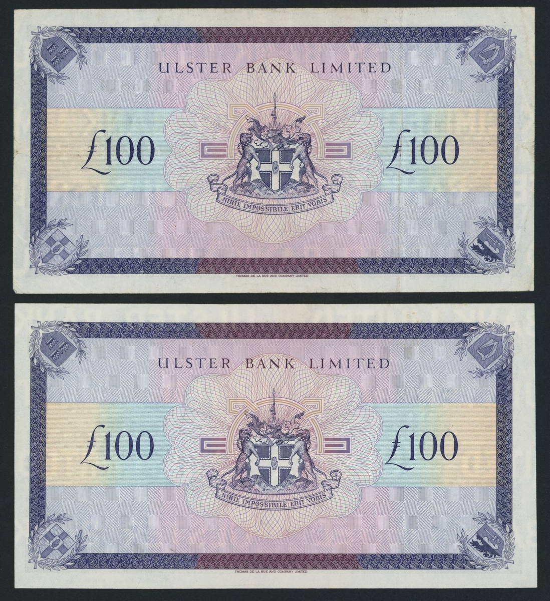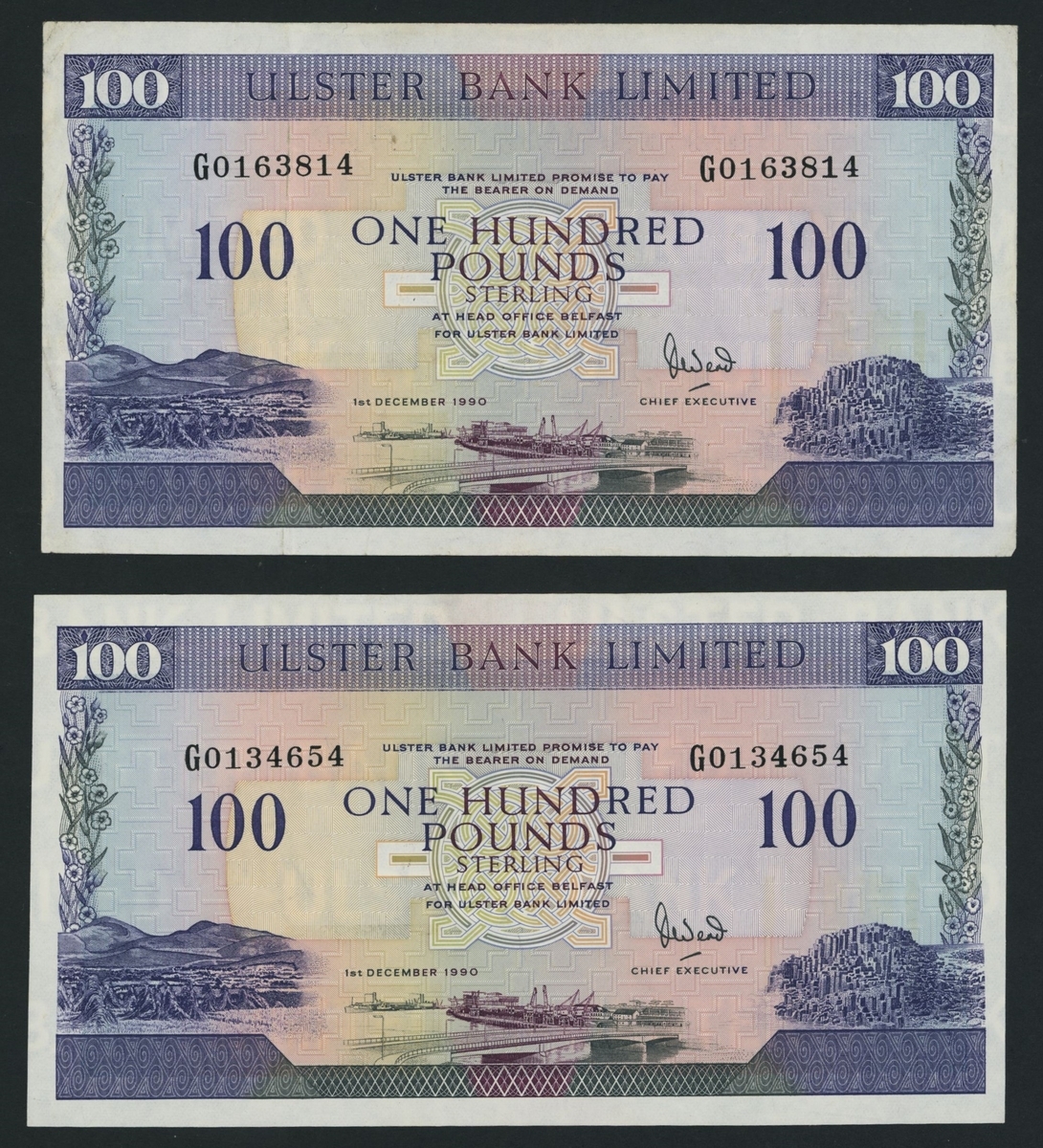 Ulster Bank Limited, Northern Ireland, [2 notes], £100, 1st December 1990, serial numbers G0134654 and G0163814, (PMI UB 86), about uncirculated, good very fine (2 notes)