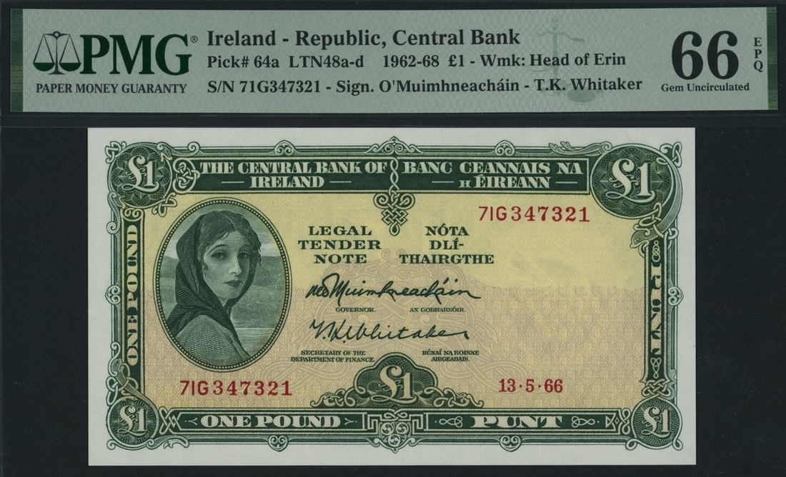(x) Central Bank of Ireland, Republic of Ireland, £1, 13th May 1966, serial number 71G347321, (Pick 64a, LTN 48a-d, BNB 209a1), in PMG holder 66 EPQ Gem Uncirculated