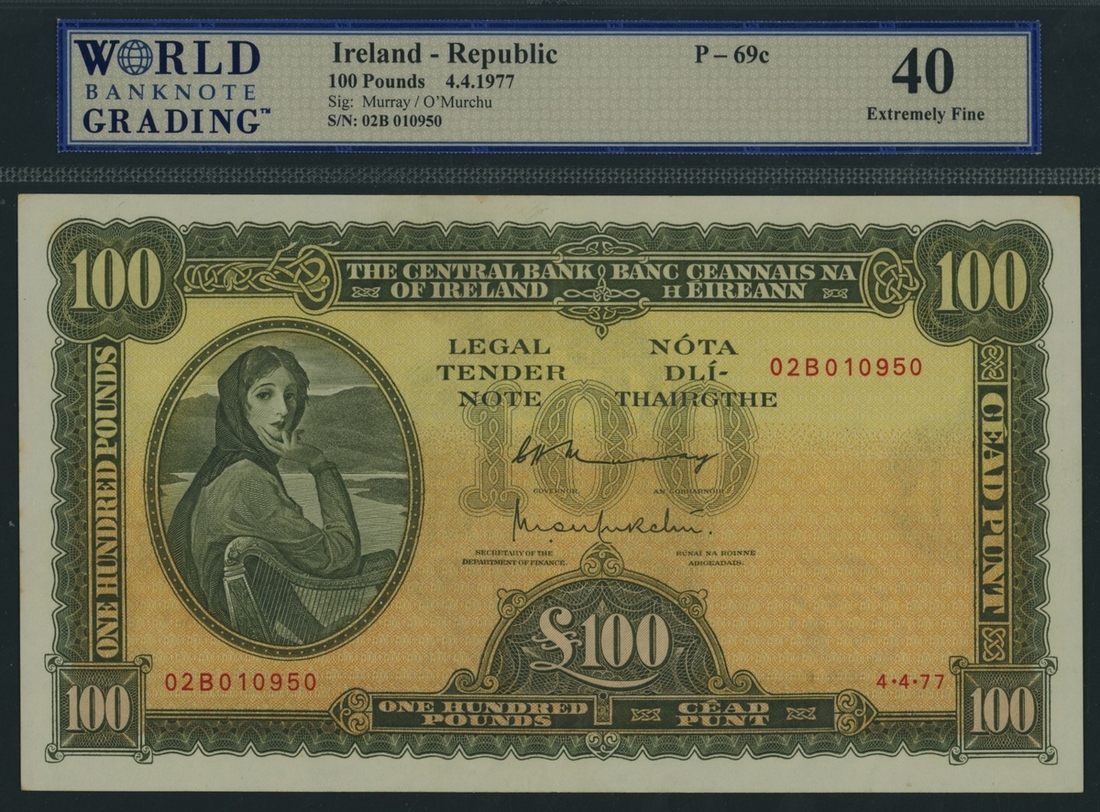(x) The Central Bank of Ireland, £100, 4th April 1977, serial number 02B 010950, (PMI LTN 67, Pick 69c), in WBG holder 40 Extremely Fine