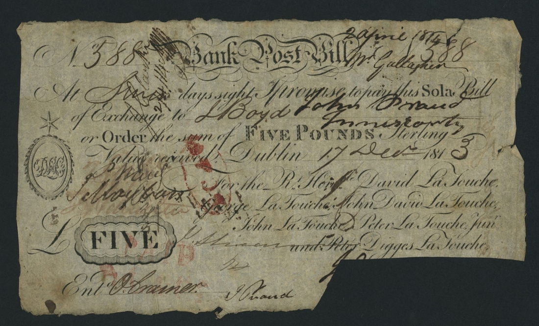 Bank Post Bill, £5, Dublin, 17th December 1813, serial number 588, (PMI PB 175c), good, cut cancelled, stamps and annotations
