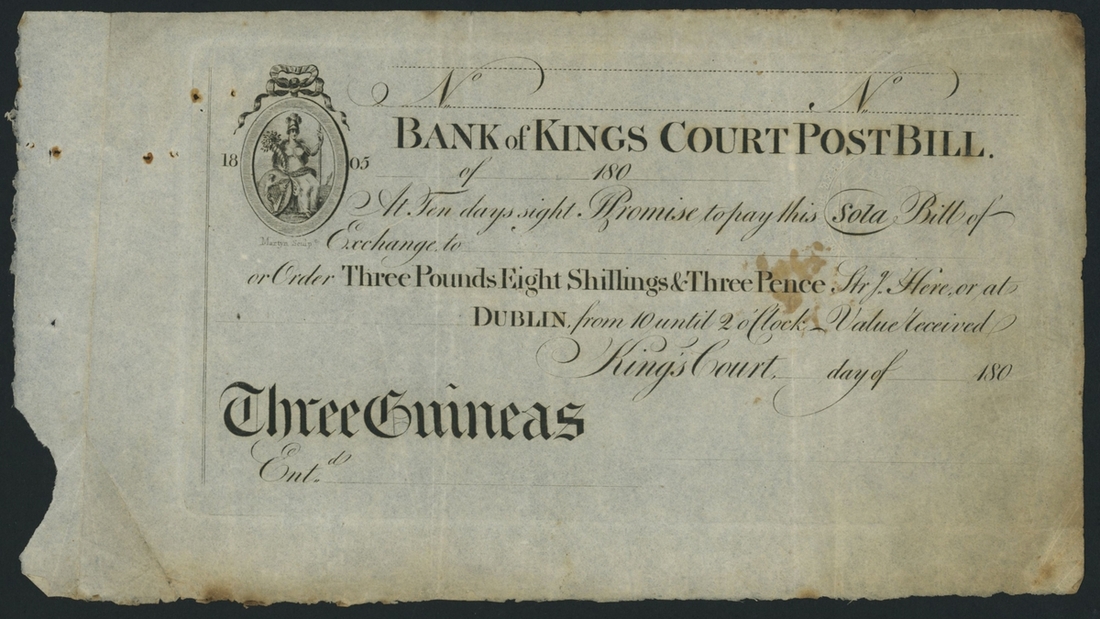 Bank of Kings Court Post Bill, proof £3, 8 Shillings and 3 Pence, Dublin, dated 180-, (PMI PB 265), edge wear, pinholes, stain and burns, otherwise very fine, note unaffected by damage to selvage