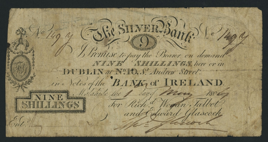 The Silver Bank, Bank of Ireland, 9 Shillings, Malahide, Dublin, 1st May 1804, serial number 1497, (PMI PB 293), very good