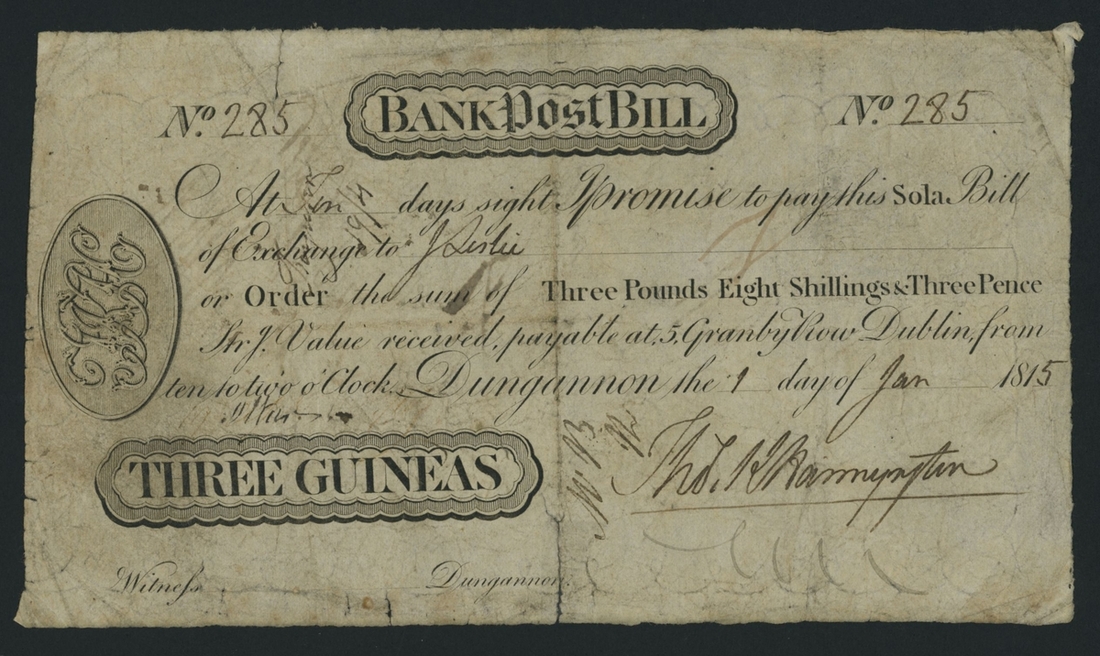 Bank Post Bill, 3 Guineas, Dungannon, 1st January 1815, serial number 285, (PMI PB224 for type), very good