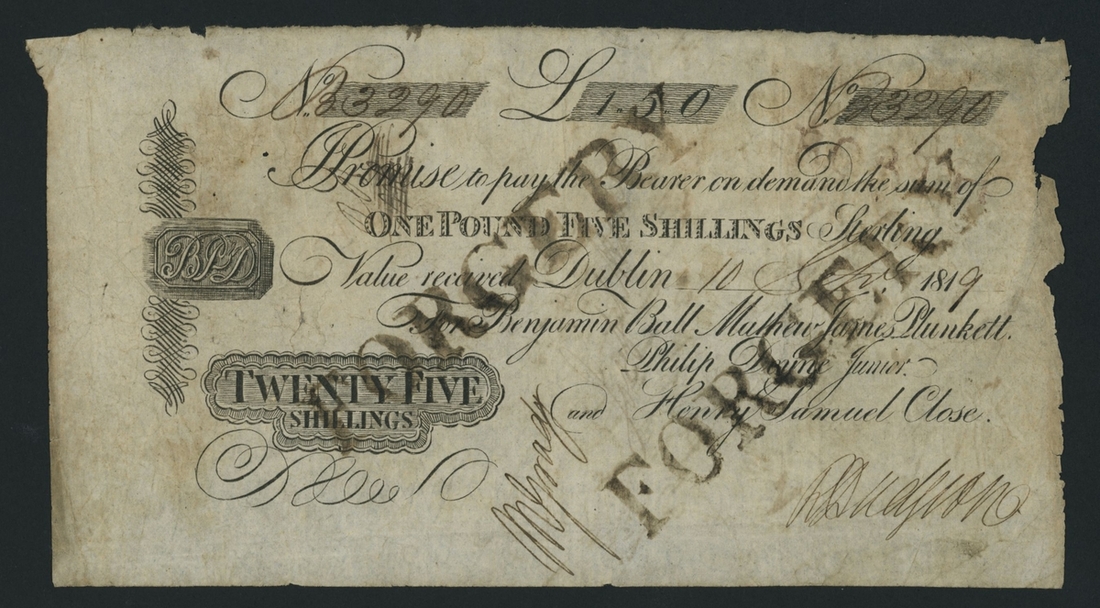 Ireland, £1 25 Shillings forgery, Dublin, 10th September 1819, serial number B3290, (PMI PB113), very good