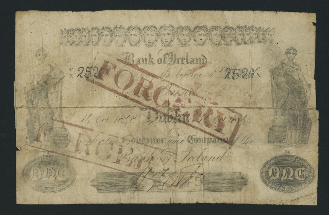 Bank of Ireland £1 with 'FORGERY' stamp over obverse,