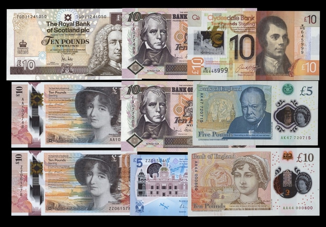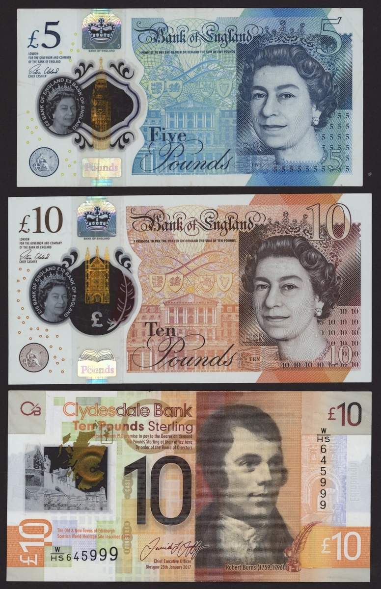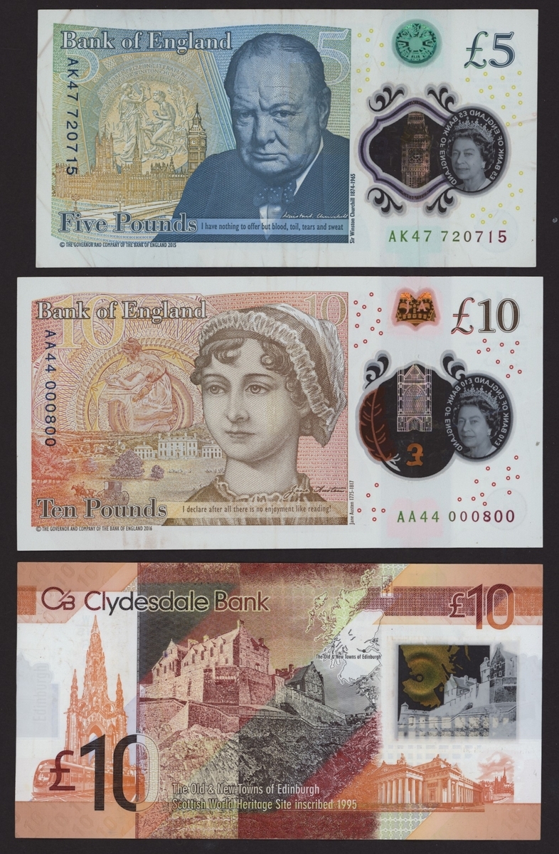 Great Britain and Scotland, Group of 9 notes, including consecutive pair, replacement, 1st prefix and commemorative, Bank of England: