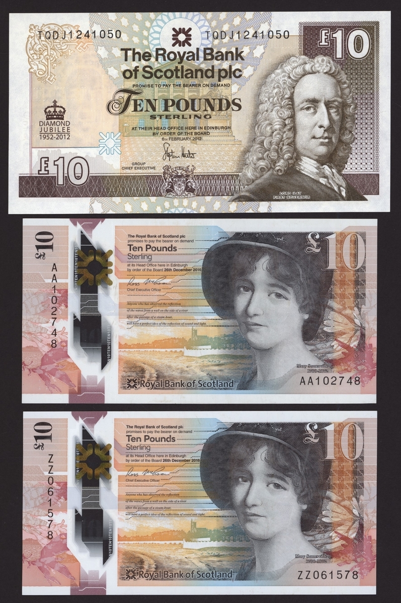 First Prefix £10, Edinburgh, 26th December 2016, serial number AA102748,