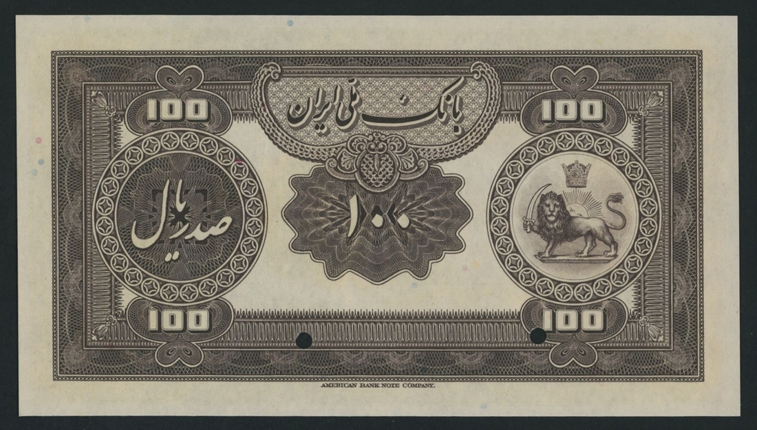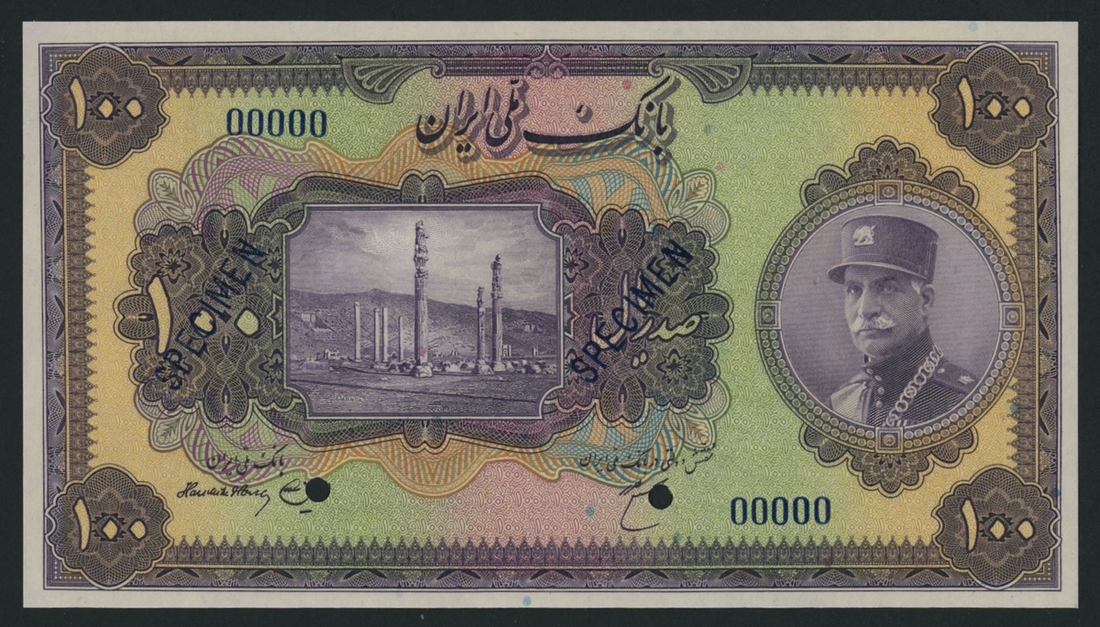 (x) Bank Melli, Iran, specimen 100 Rials, ND (1933), serial number 00000, (Pick 28s, BNB 111), uncirculated. This lot might be subject to import restrictions into certain countries. It is the responsibility of the Buyer to be aware of any restrictions imposed upon importation into the final destination.