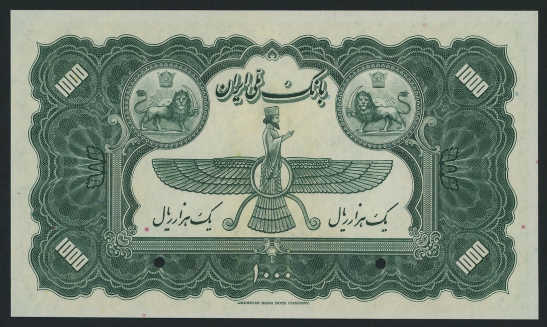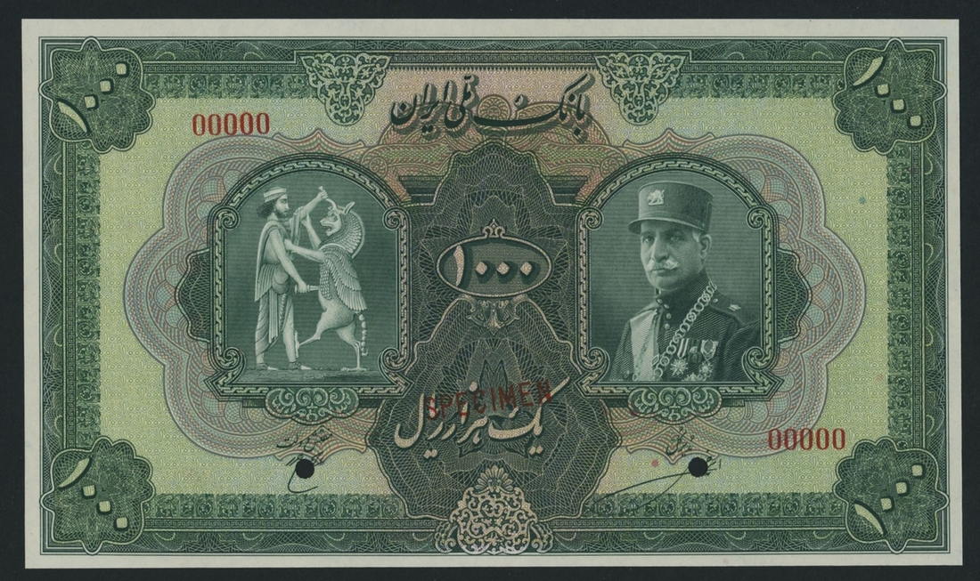 (x) Bank Melli, Iran, specimen 1000 Rials, ND (1931), serial number 00000, (Pick 30s, BNB 114), uncirculated. This lot might be subject to import restrictions into certain countries. It is the responsibility of the Buyer to be aware of any restrictions imposed upon importation into the final destination.