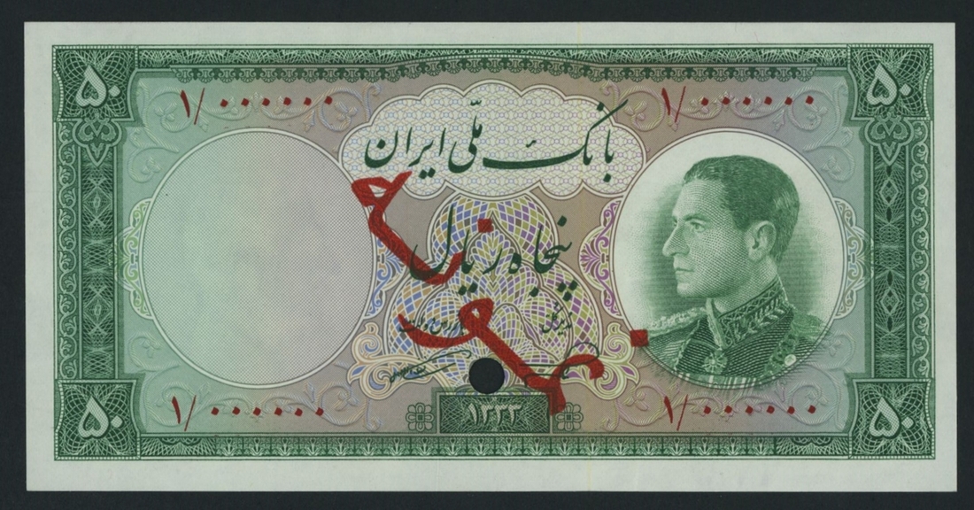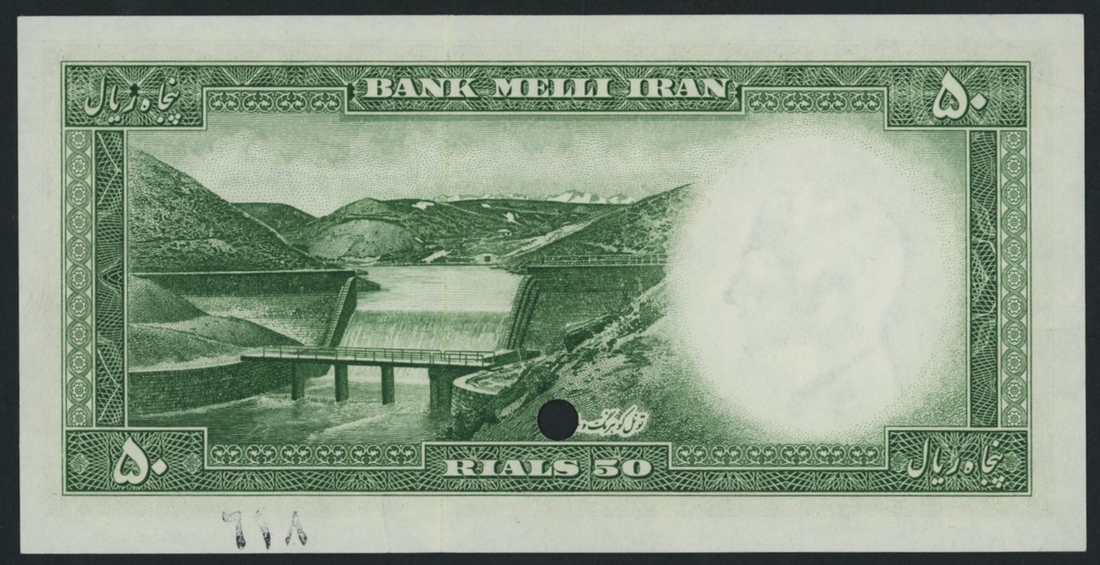 (x) Bank Melli, Iran, specimen 50 Rials, ND (1954), serial number 1/000000, (Pick 66s, BNB 156), about uncirculated. This lot might be subject to import restrictions into certain countries. It is the responsibility of the Buyer to be aware of any restrictions imposed upon importation into the final destination.