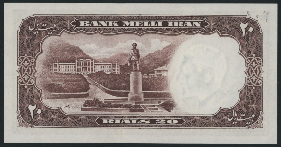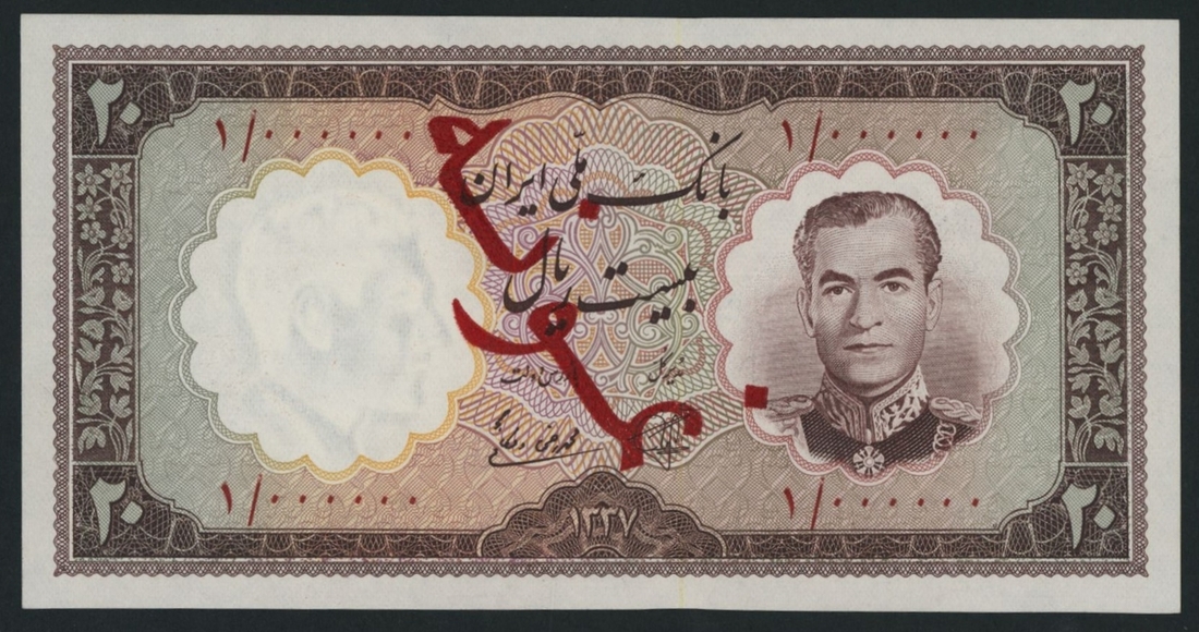 (x) Bank Melli, Iran, specimen 20 Rials, 1958, serial number 1/000000, (Pick 69s, BNB 159), uncirculated. This lot might be subject to import restrictions into certain countries. It is the responsibility of the Buyer to be aware of any restrictions imposed upon importation into the final destination.