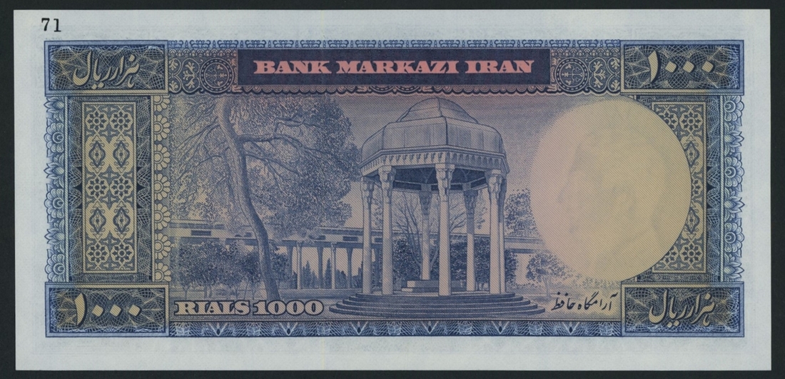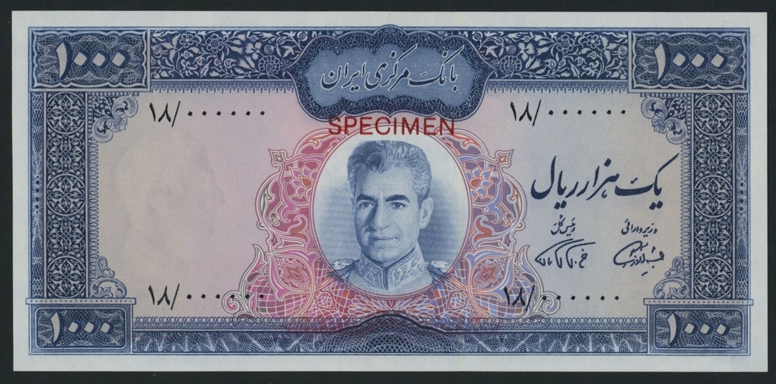 (x) Bank Markazi, Iran, colour trial specimen 1000 Rials, ND (1971-1973), serial number 18/000000, (Pick 94cts, BNB 225), good about uncirculated. This lot might be subject to import restrictions into certain countries. It is the responsibility of the Buyer to be aware of any restrictions imposed upon importation into the final destination.