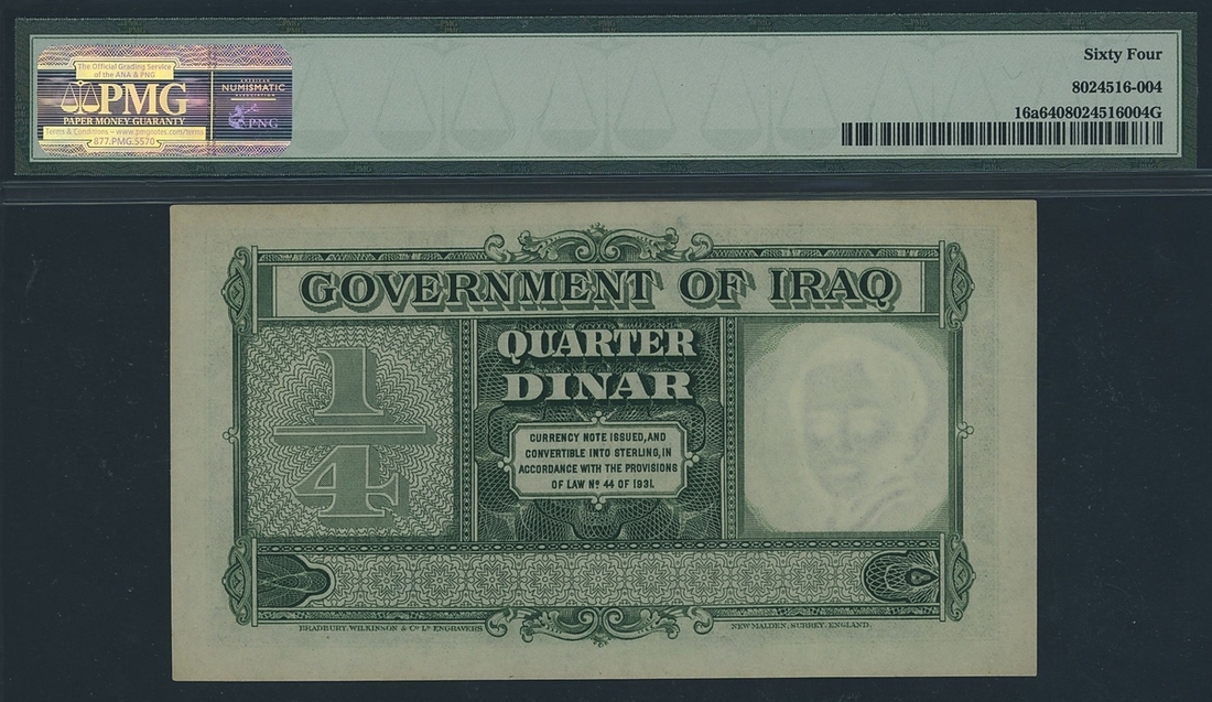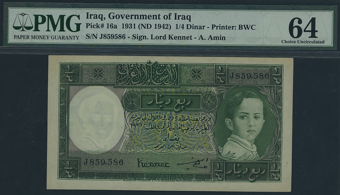 Government of Iraq, 1/4 Dinar, 1942, serial number J 859586, (Pick 16a), in PMG holder 64 Choice Uncirculated