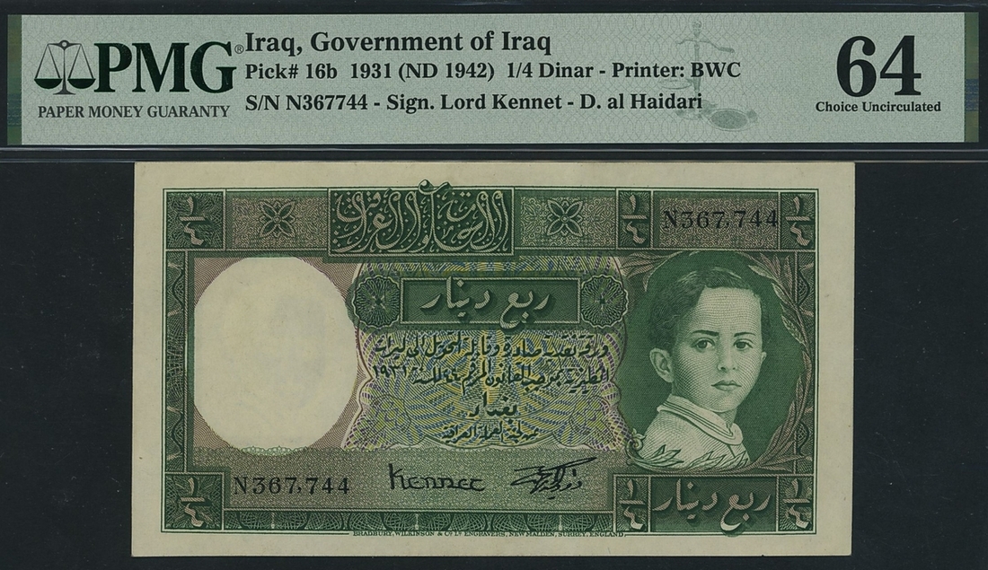 Government of Iraq, 1/4 Dinar, 1942, serial number N 367744, (Pick 16b), in PMG holder 64 Choice Uncirculated