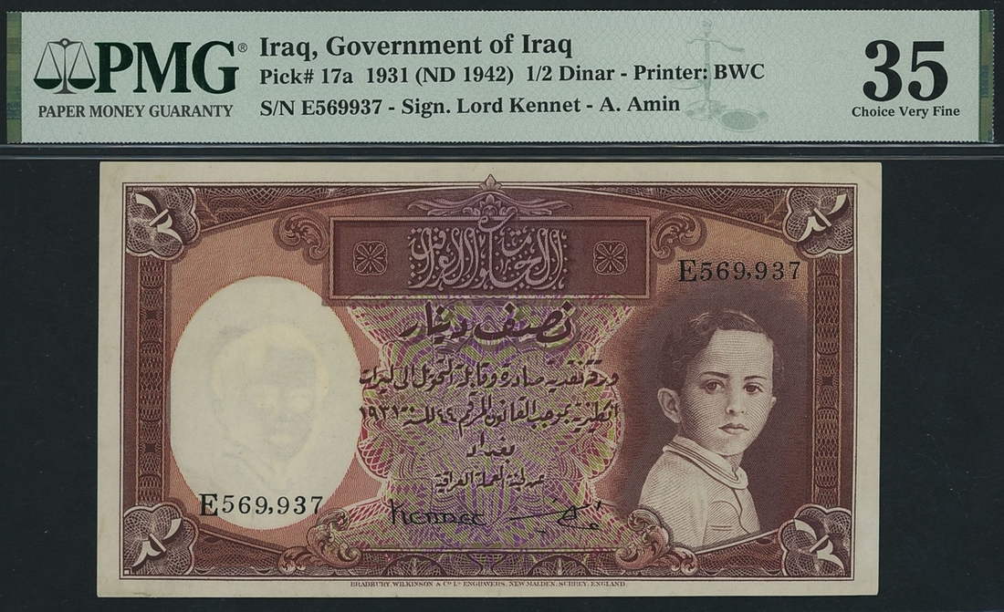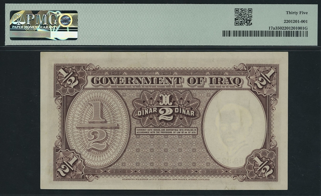 Government of Iraq, 1/2 Dinar, 1942, serial number E 569937, (Pick 17a), in PMG holder 35 Choice Very Fine