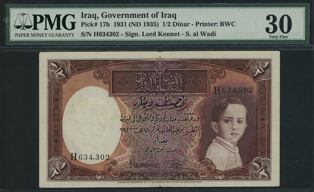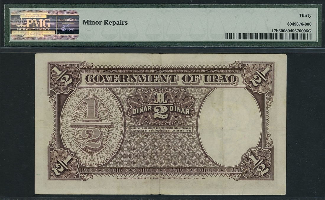 Government of Iraq, 1/2 Dinar, 1942, serial number H 634302, (Pick 17b), in PMG holder 30 Very Fine, minor repairs