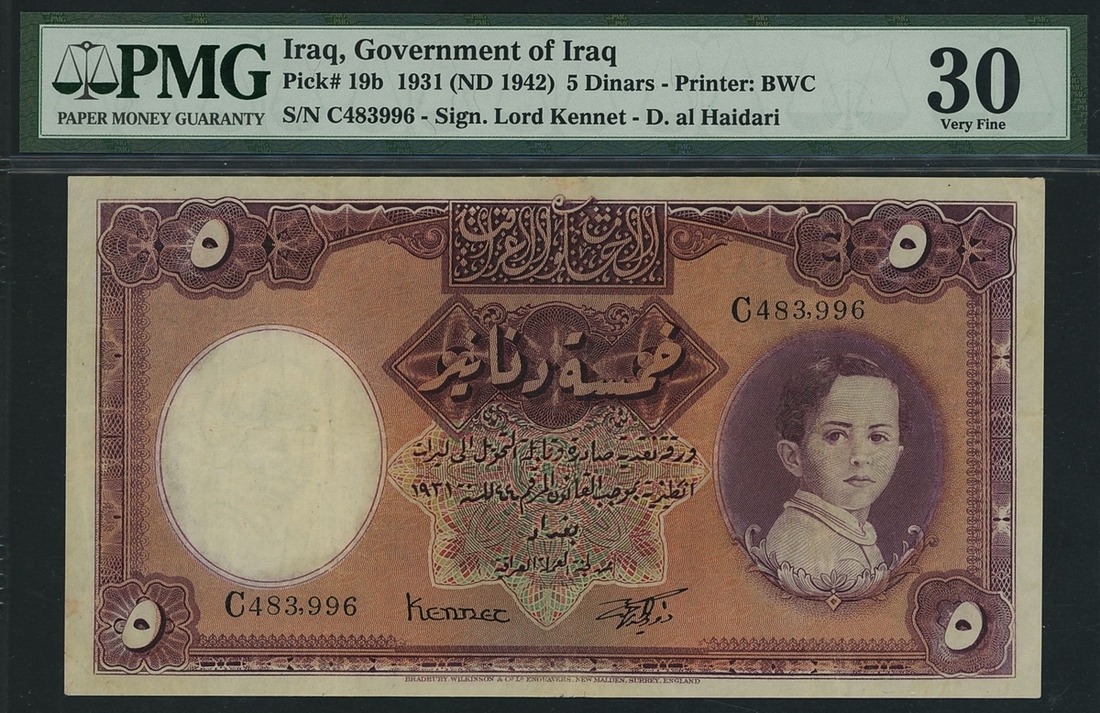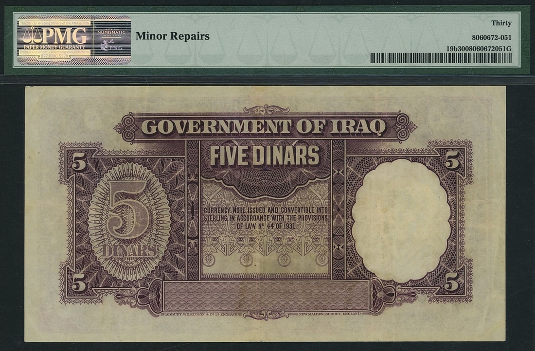 Government of Iraq, 5 Dinars, 1942, serial number C 483996, (Pick 19b), in PMG holder 30 Very Fine, minor repairs