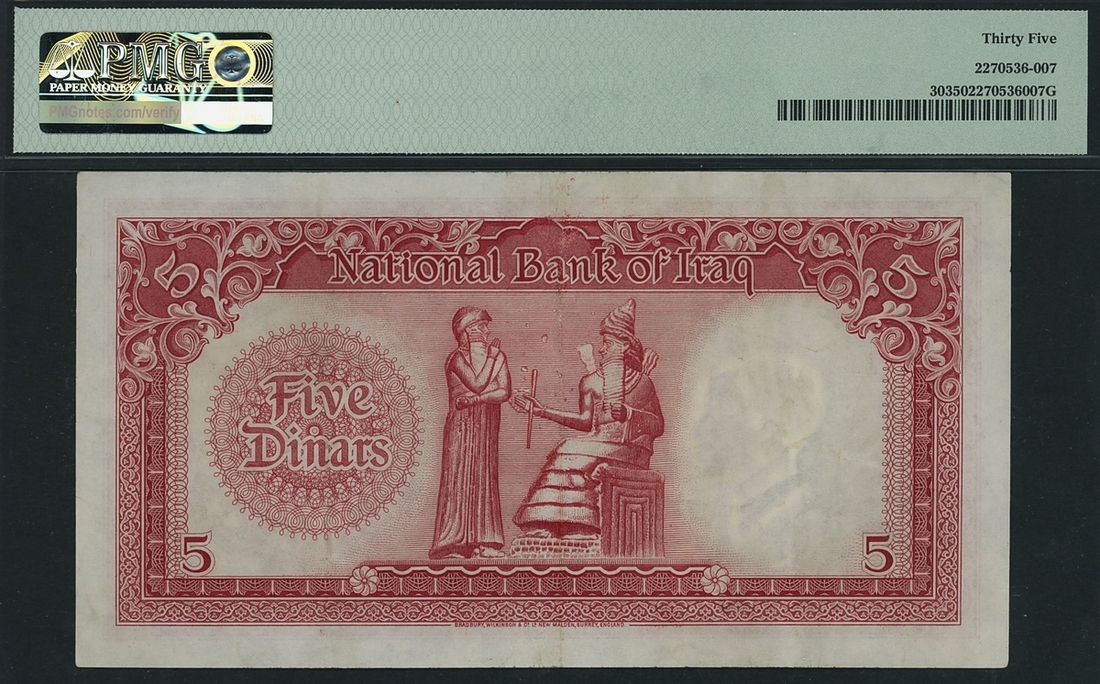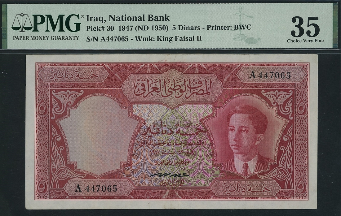Government of Iraq, 5 Dinars, 1950, serial number A 447065, (Pick 30), in PMG holder 35 Choice Very Fine