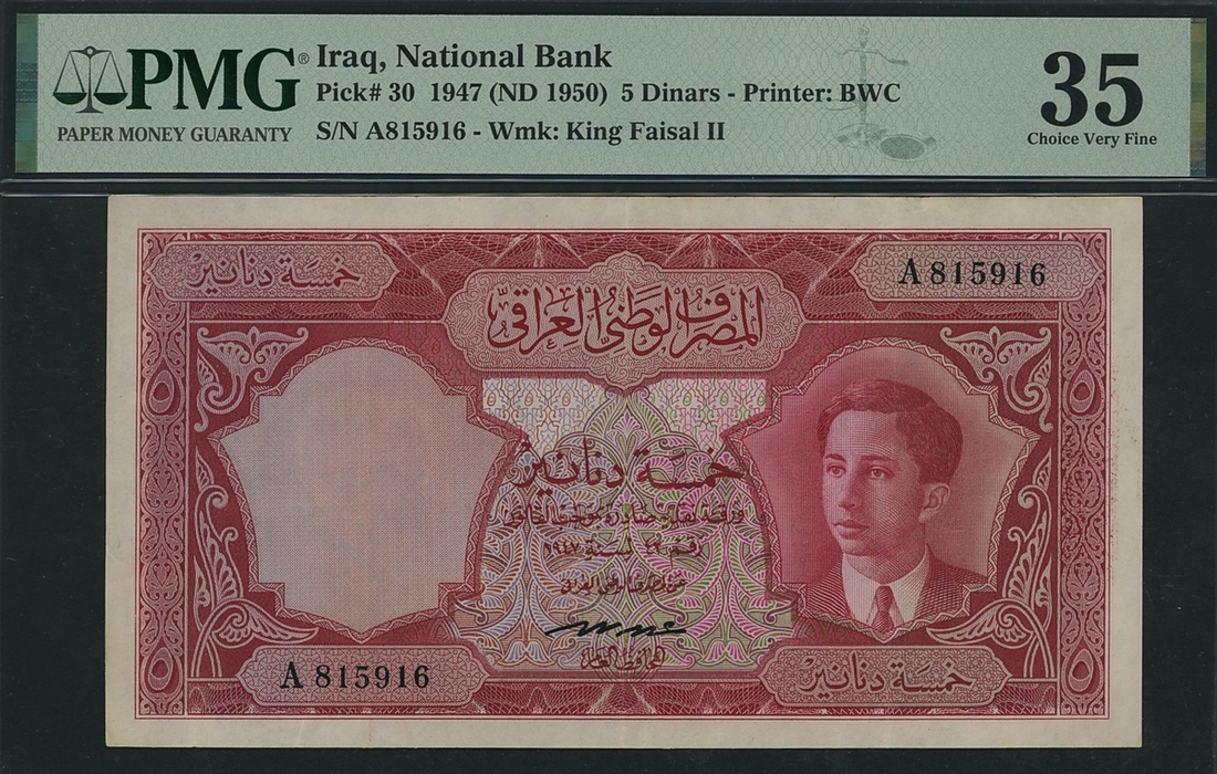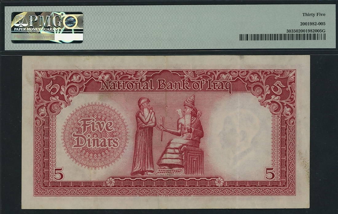 Government of Iraq, 5 Dinars, 1950, serial number A 815916, (Pick 30), in PMG holder 35 Choice Very Fine