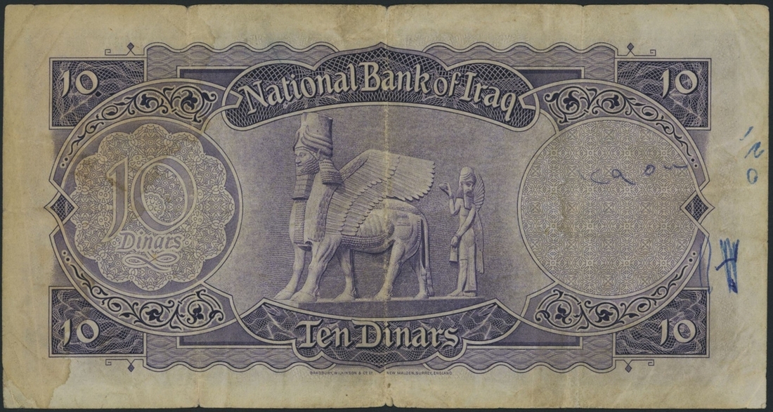 (x) National Bank of Iraq, 10 Dinars, 1947, serial number B574687, (Pick 31, BNB 205), very fine, heavy folds and staining