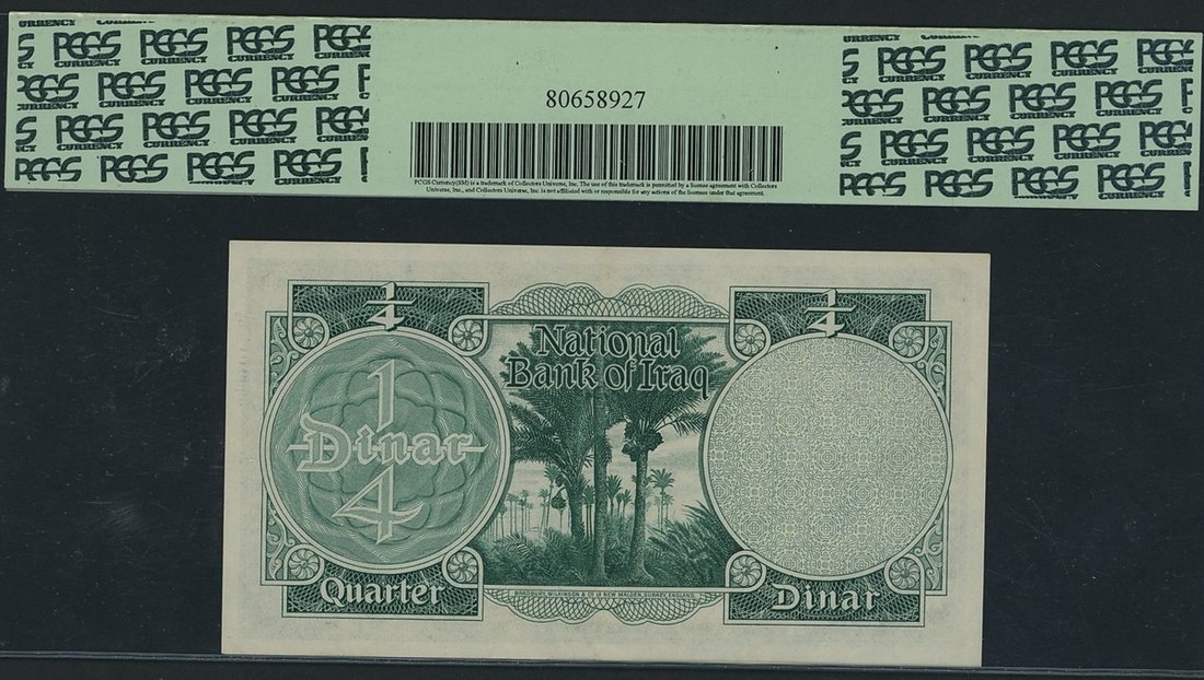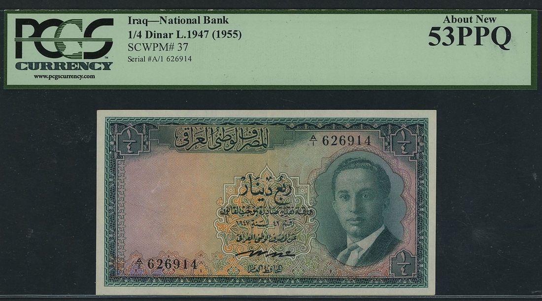 Government of Iraq, 1/4 Dinar, 1955, serial number A/1 626914, (Pick 37), in PCGS holder 53 PPQ About New