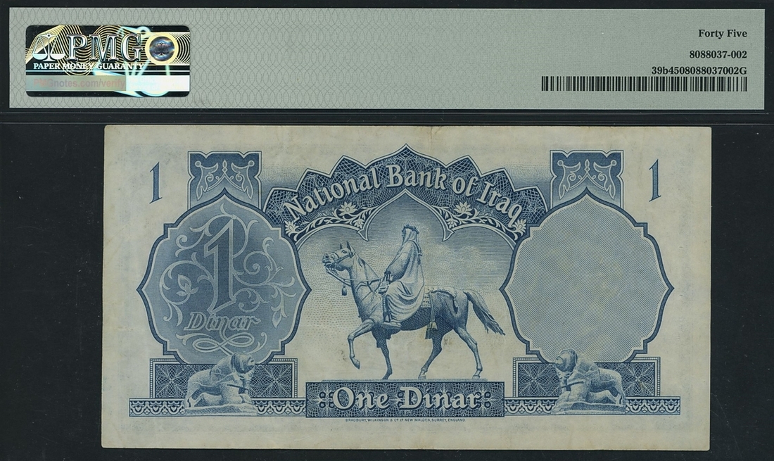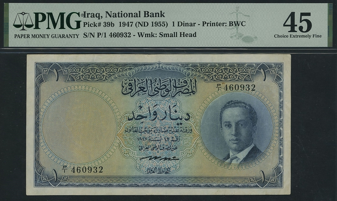 Government of Iraq, 1 Dinar, 1955, serial number P/1 460932, (Pick 39b), in PMG holder PMG 45 Choice Extremely Fine