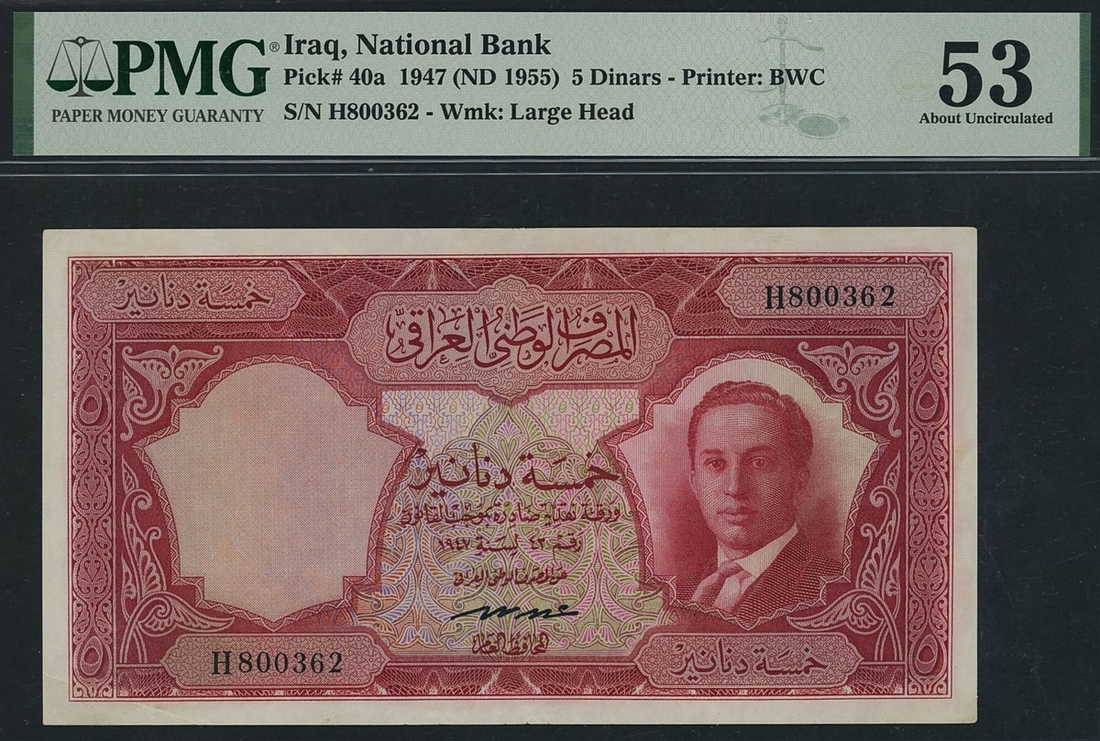 Government of Iraq, 5 Dinars, 1955, serial number H 800362, (Pick 40a), in PMG holder PMG 53 About Uncirculated, only one note awarded a higher grade by PMG