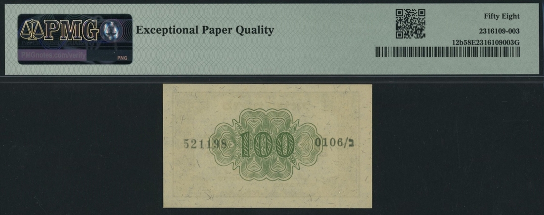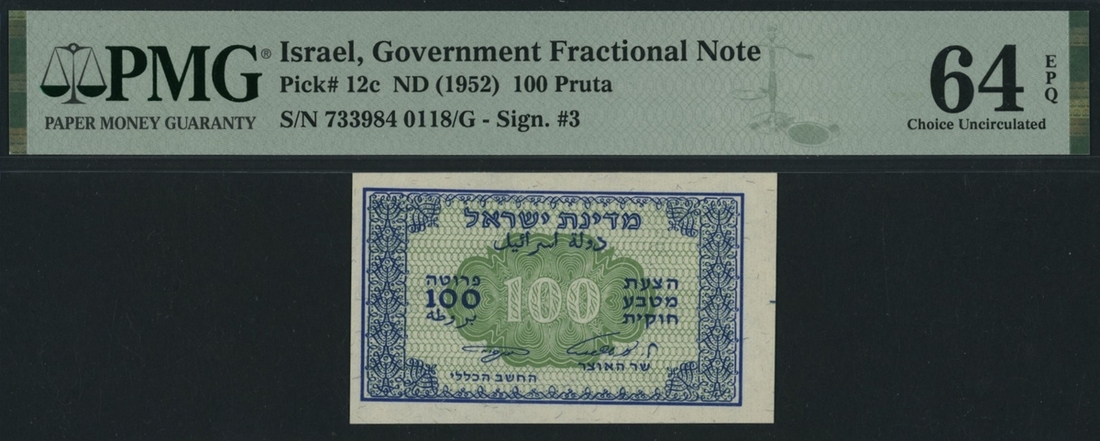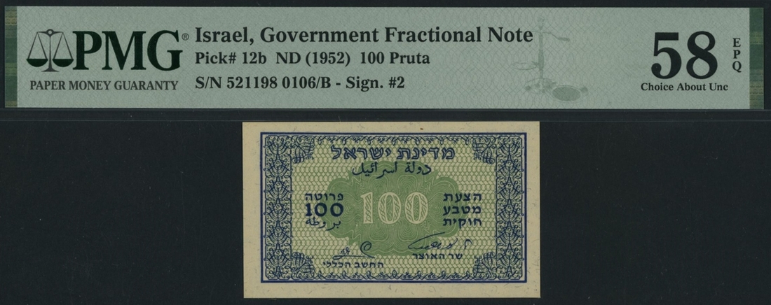 (x) Government Fractional Note, Israel, (2 notes) 100 Pruta, ND (1952), serial number 521198 0106/B, 733984 0118/G, Zagaggi/Eshkol and Neman/Eshkol signatures,