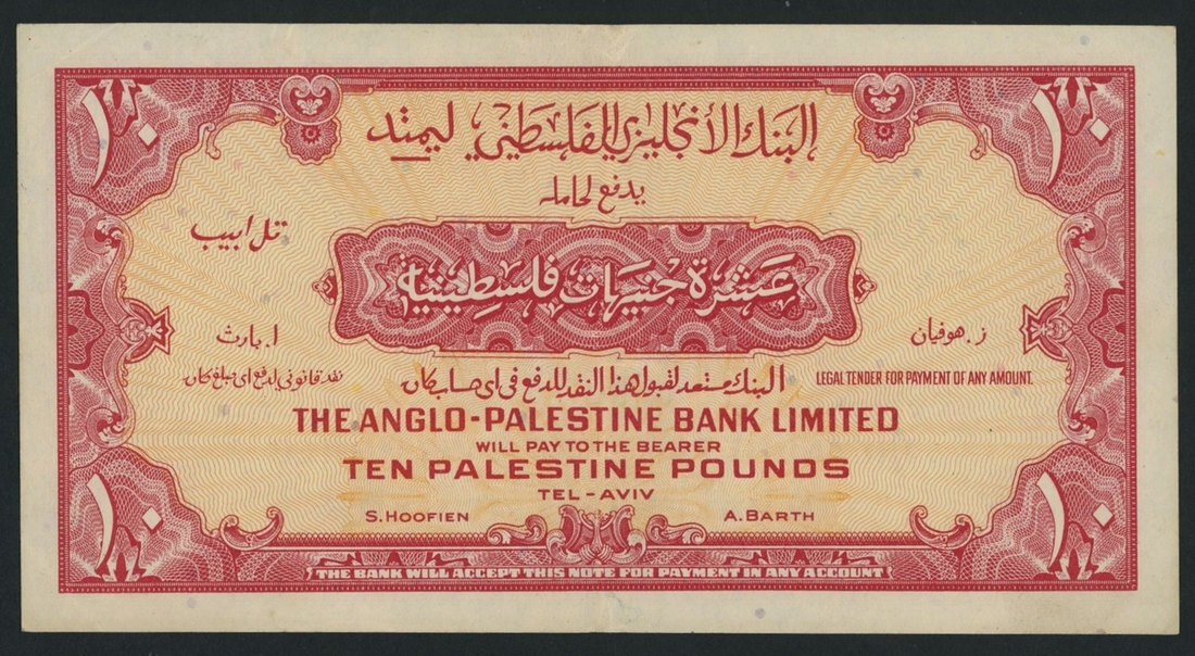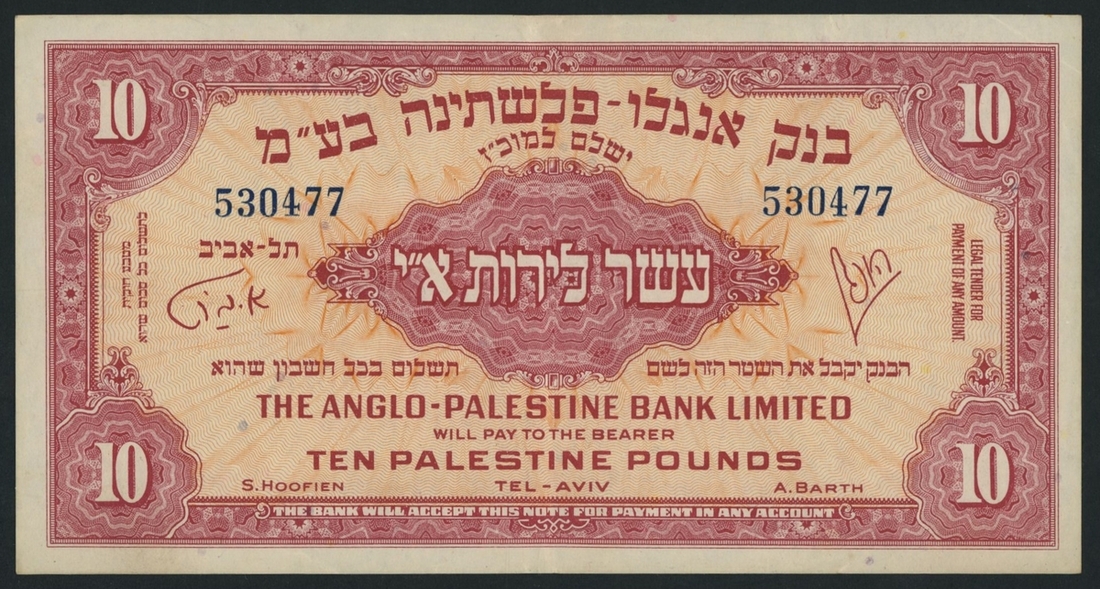(x) The Anglo-Palestine Bank Limited, Israel, 10 Palestine Pounds, Tel-Aviv, ND (1948), serial number 530577, (Pick 17 BNB 109), good very fine