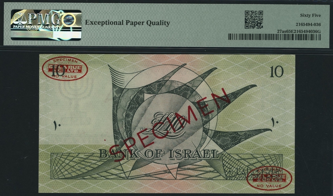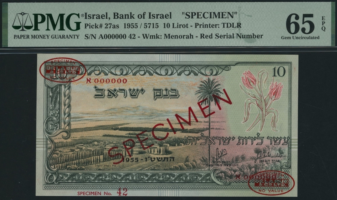 (x) Bank of Israel, specimen 10 Lirot, 1955 / 5715, red serial number A000000 42, (Pick 27as, BNB 404), in PMG holder 65 EPQ Gem Uncirculated