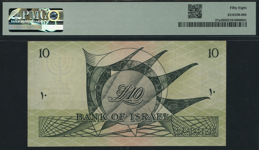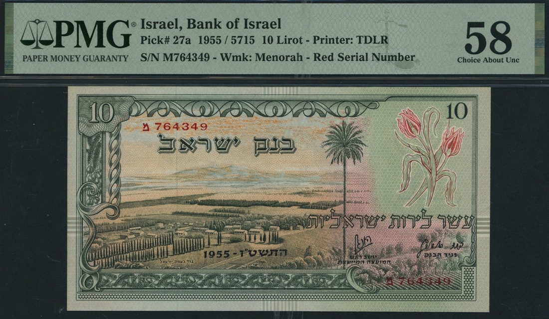 (x) Bank of Israel, 10 Lirot, 1955, serial number M764349, (Pick 27a, BNB 404a), in PMG holder 58 Choice About Uncirculated