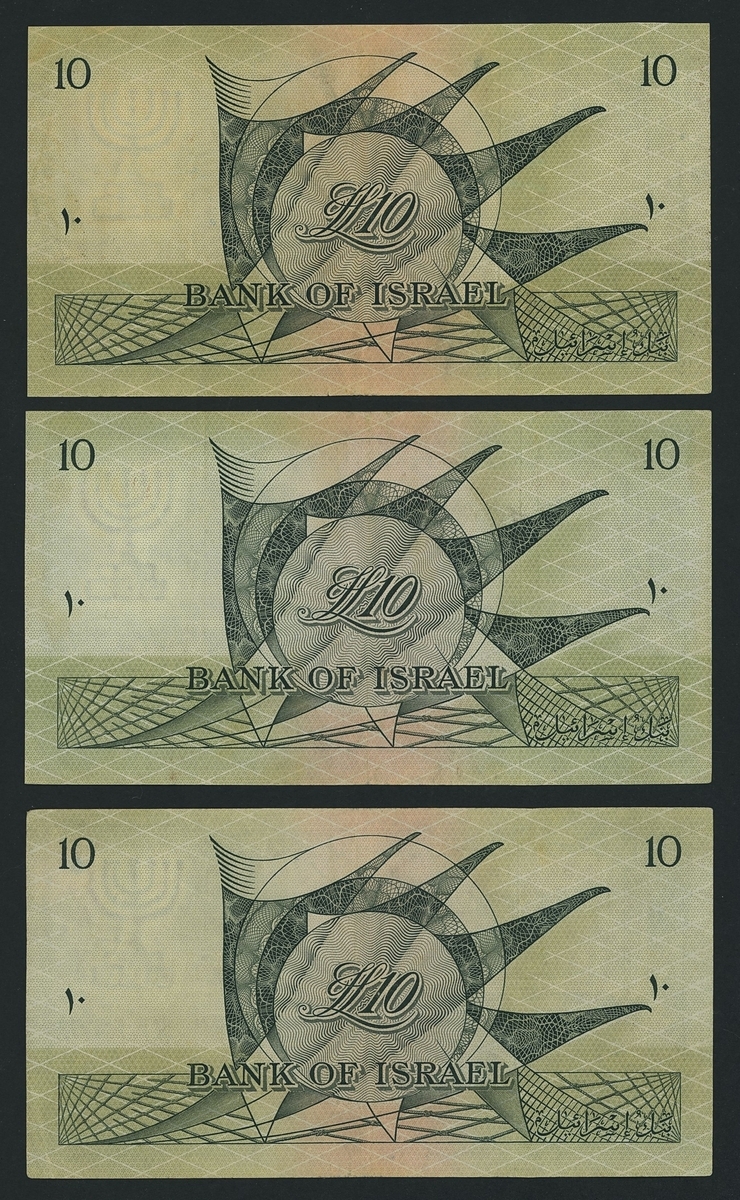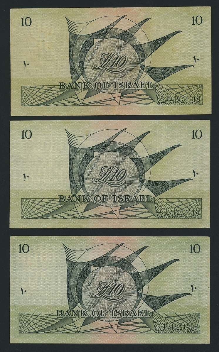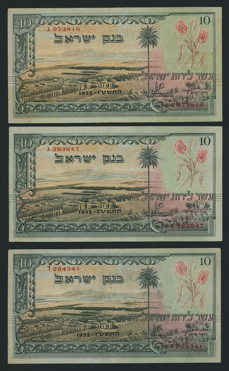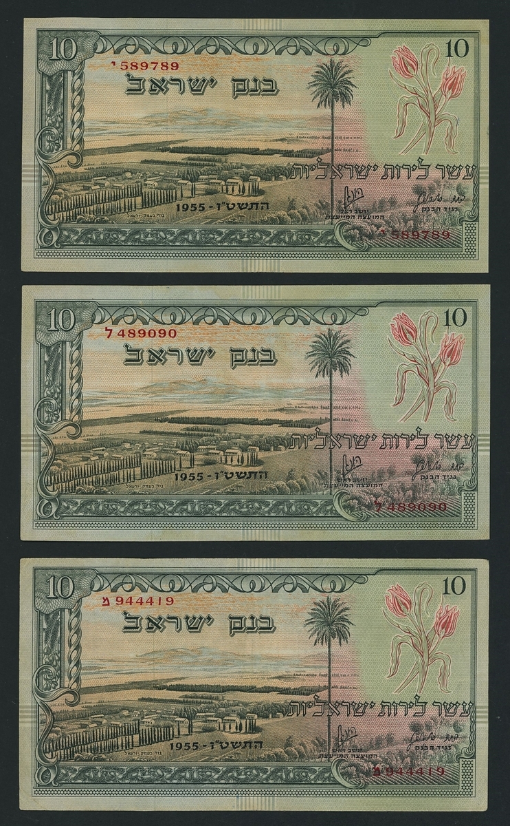 Bank of Israel, [6 notes] 10 Lirot, 1955 (1957), serial numbers G073816 and G383847, D264341, Y589789, L489090 and M944419