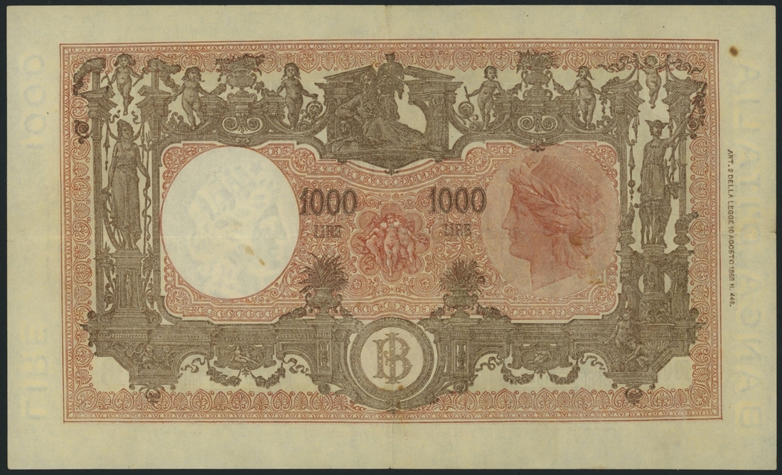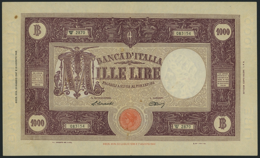 1000 Lire, 19th May 1947, serial number W2870 083154, signatures of Einaudi and Urbini;